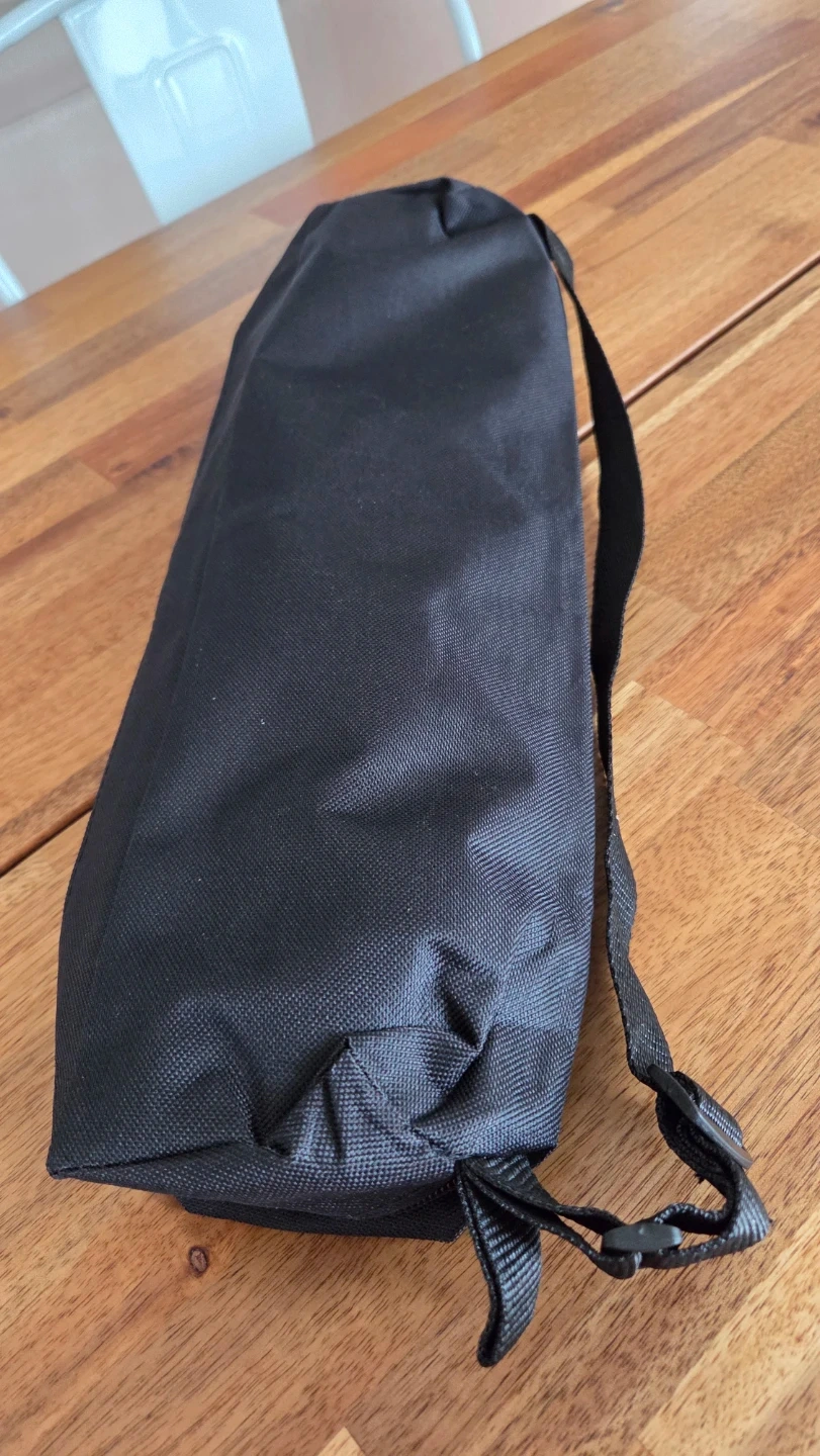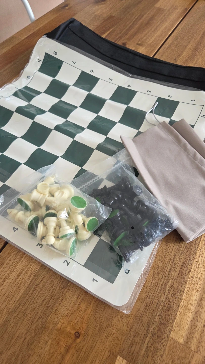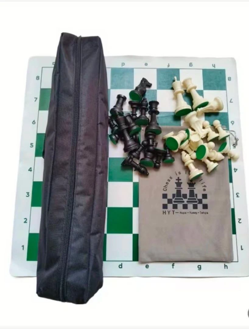This is a brand new portable chess set with a mat and plastic pieces. It includes a carrying bag for easy transport. The set comes with white and black pieces. It's great for playing chess on the go!