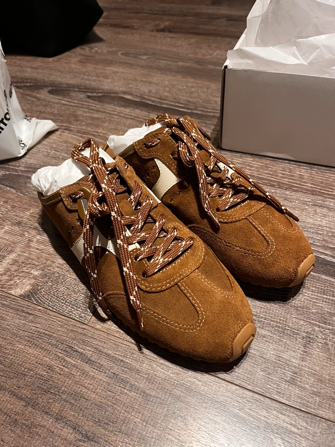Larroude Stella Mule shoes in a brown suede finish. Features white accents and a lace-up front. Includes original box and packaging. These mules are size 10.