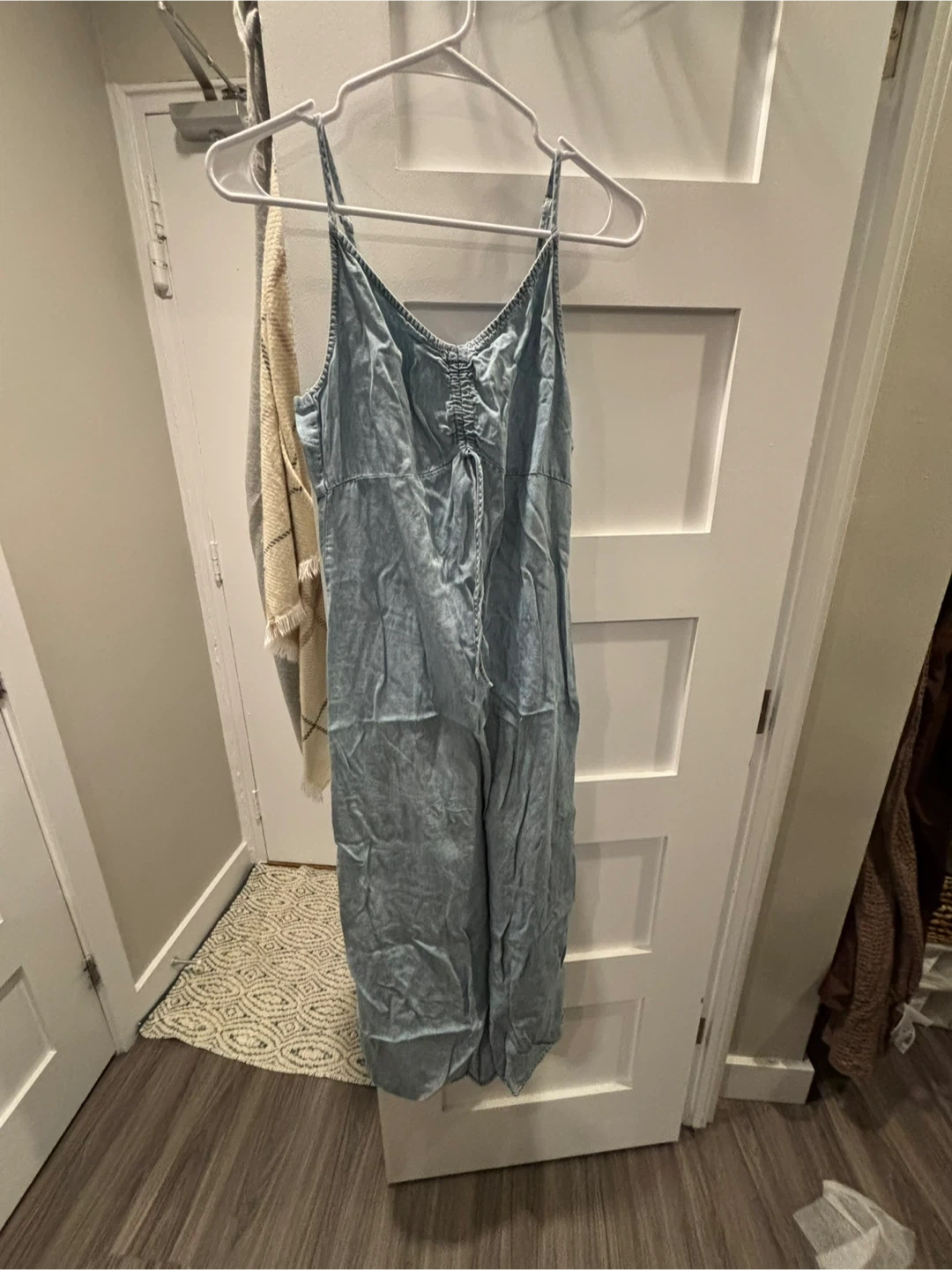 A light blue denim maxi dress with adjustable spaghetti straps and a gathered detail at the bust. It's made of a soft denim-like fabric. Perfect for casual wear on warmer days!