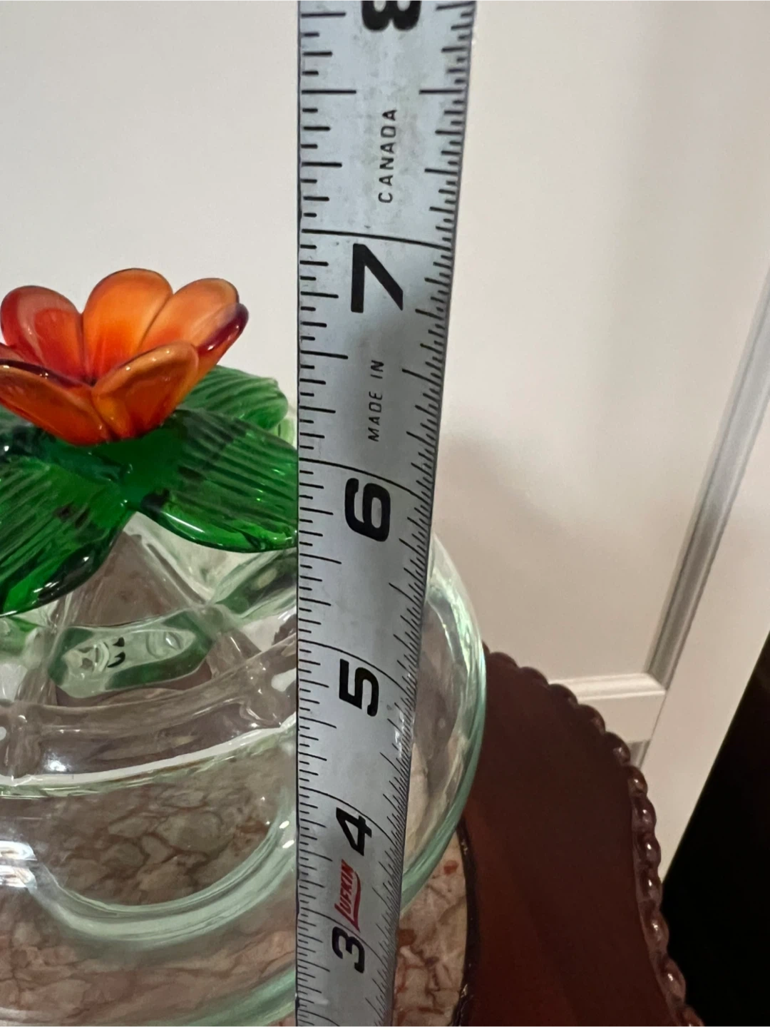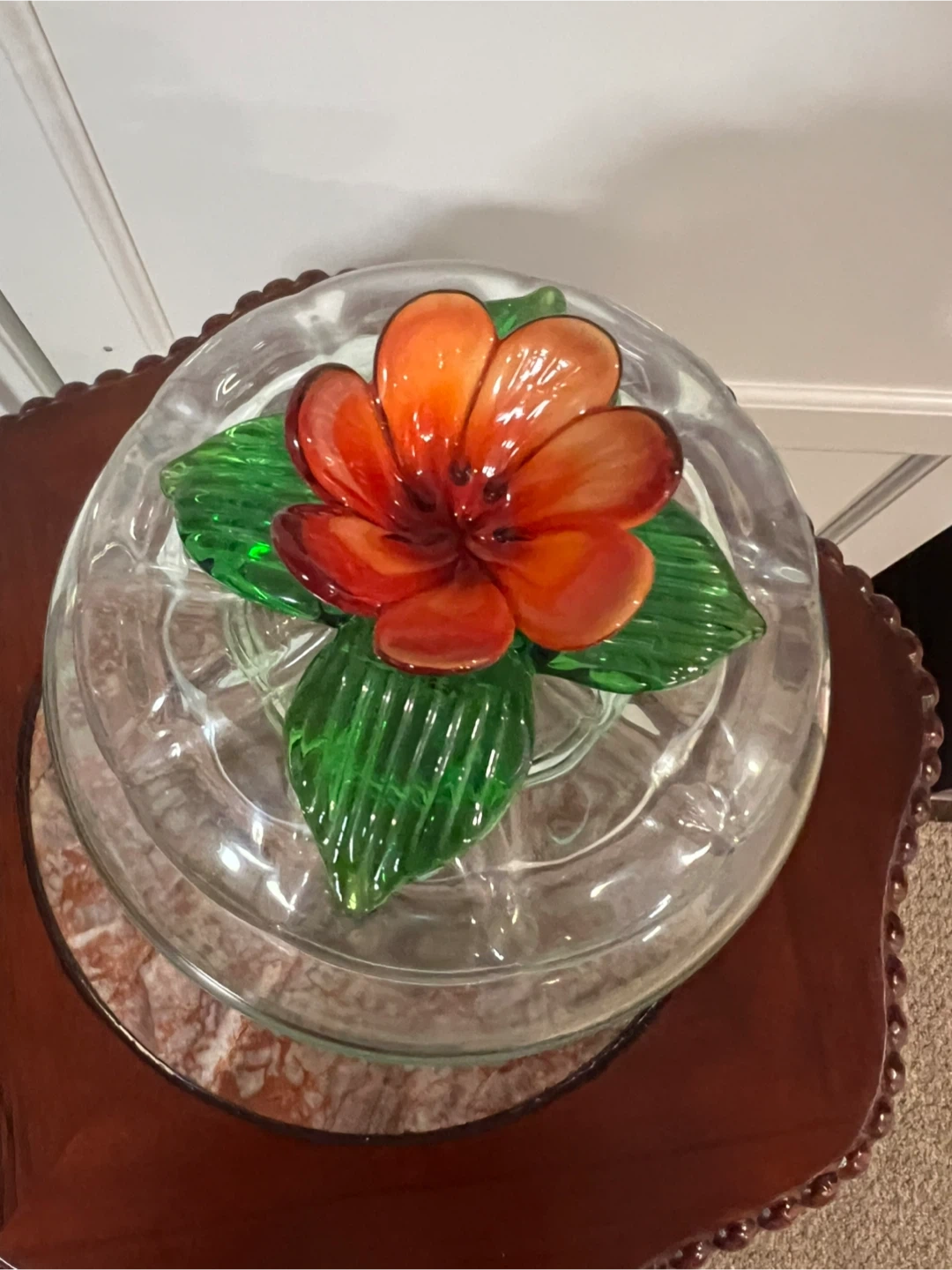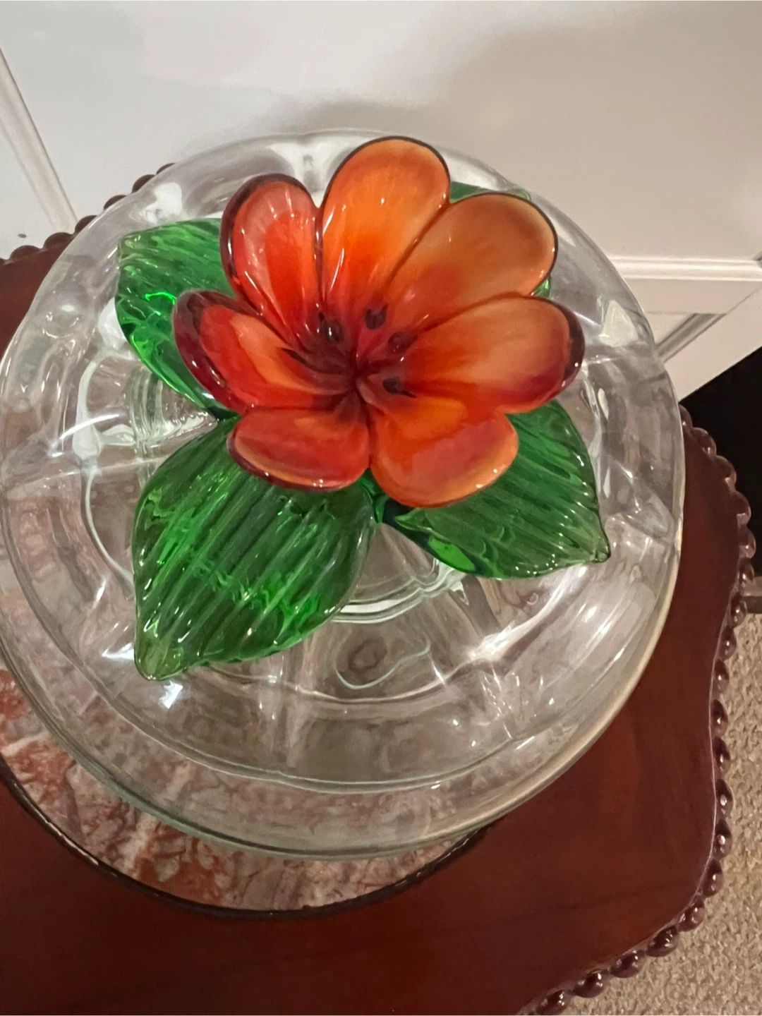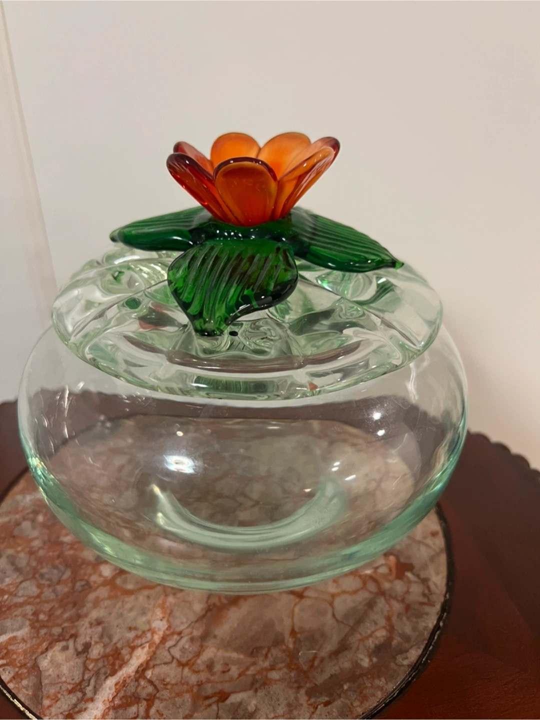 A charming glass candy dish topped with a decorative orange and green flower lid. It's made of clear glass and would look lovely on a vanity or side table. The dish measures approximately 7 inches tall.