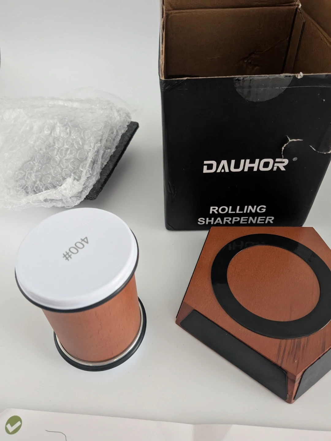 This DAUHOR rolling knife sharpener includes a 400 grit coarse side and a 1000 grit fine side for sharpening. It's designed for knives with specific angles and comes with instructions. Sharpens efficiently without water.