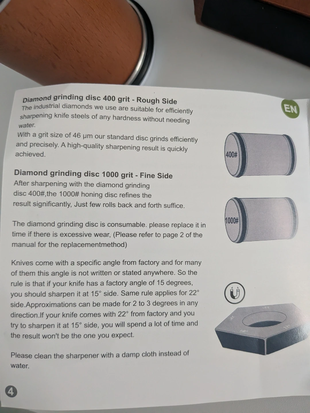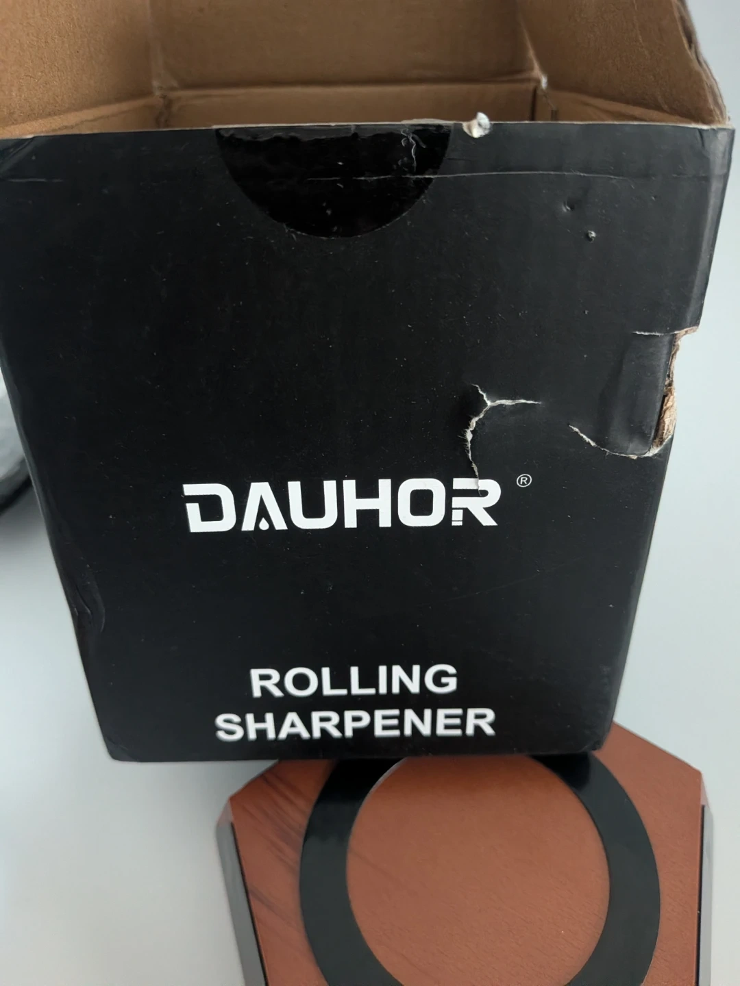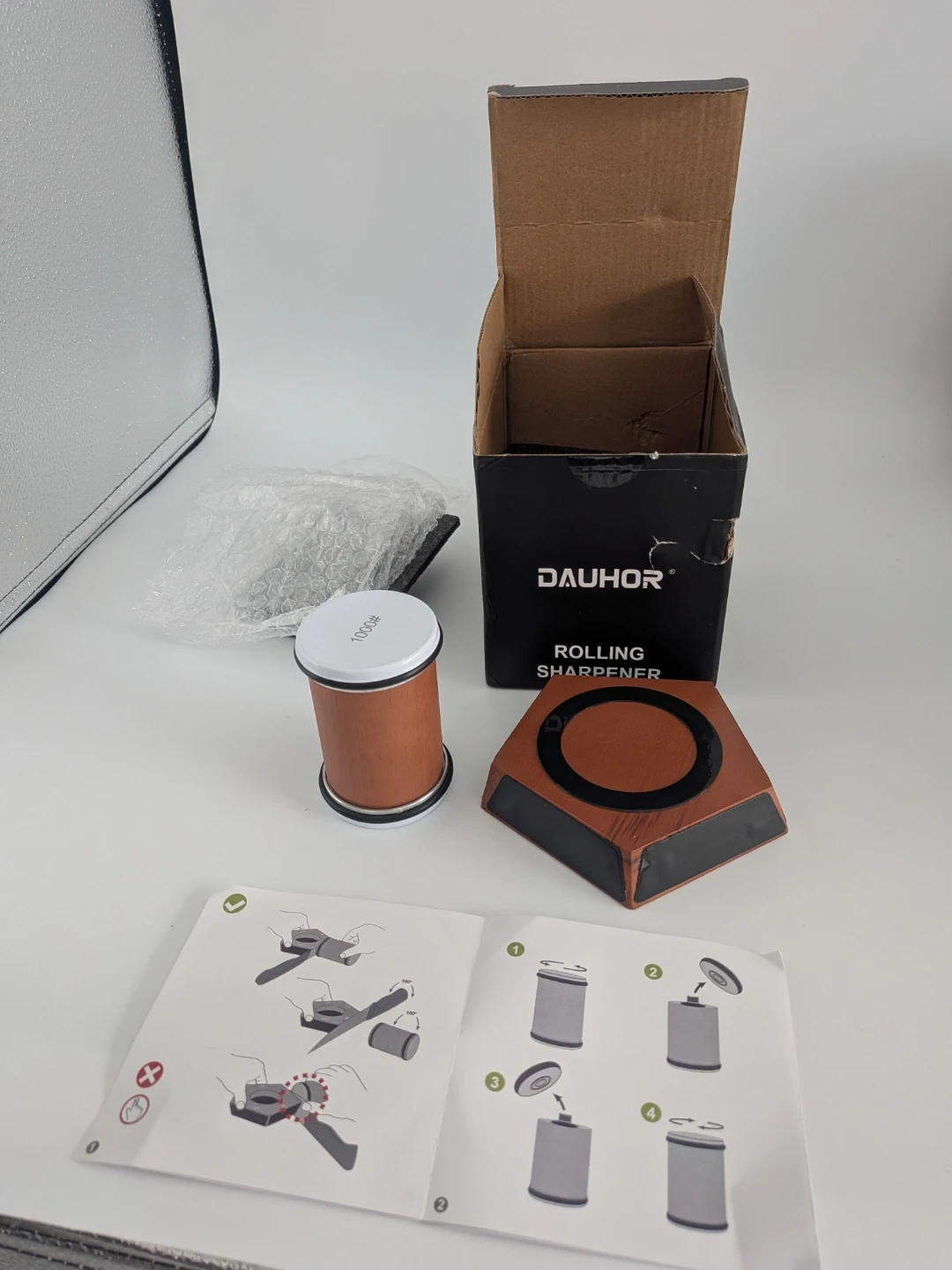This DAUHOR rolling knife sharpener includes a 400 grit coarse side and a 1000 grit fine side for sharpening. It's designed for knives with specific angles and comes with instructions. Sharpens efficiently without water.
