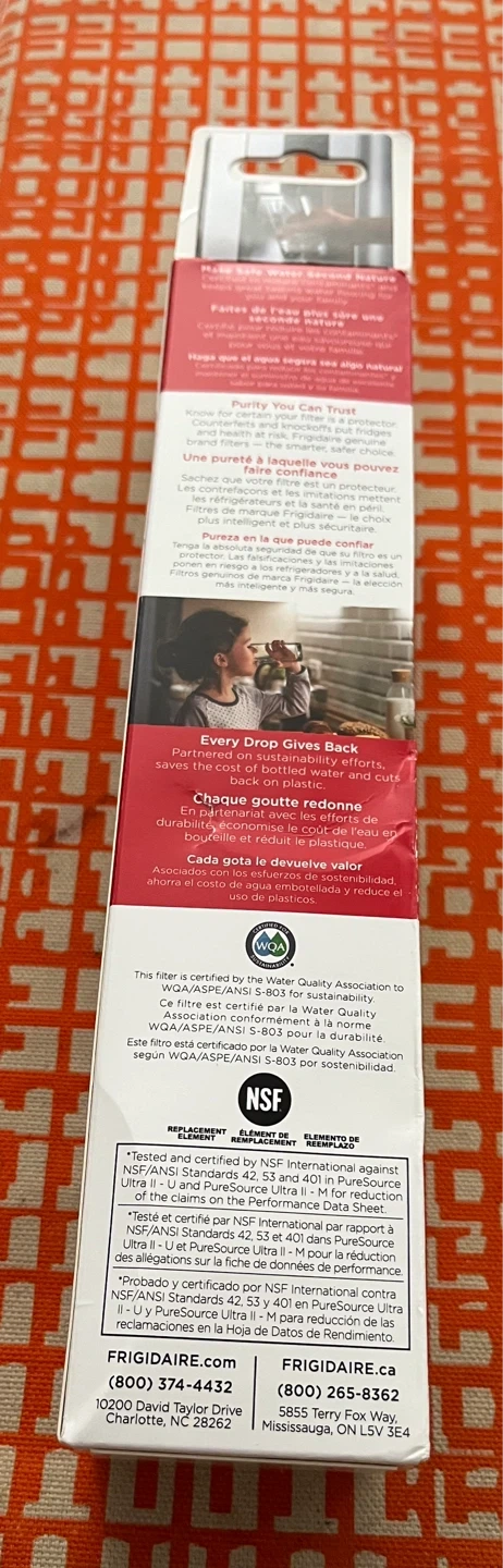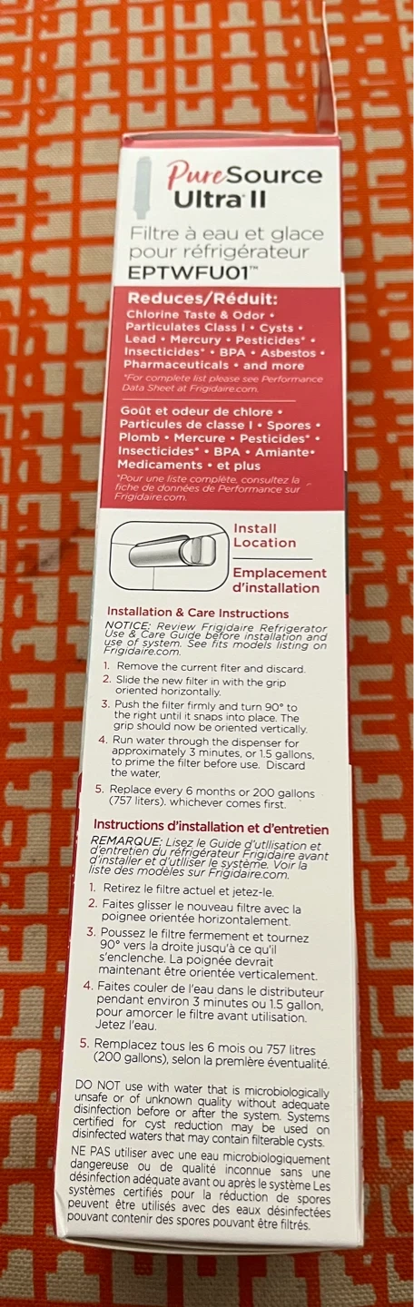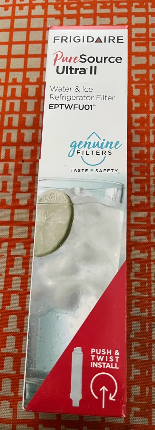 This Frigidaire PureSource Ultra II refrigerator water filter is designed for water and ice filtration. It helps reduce chlorine taste and odor, lead, mercury, pesticides, and more. Filter is certified by NSF International against NSF/ANSI Standards 42, 53, and 401 for specific contaminant reduction. Lasts for up to 6 months or 757 liters.