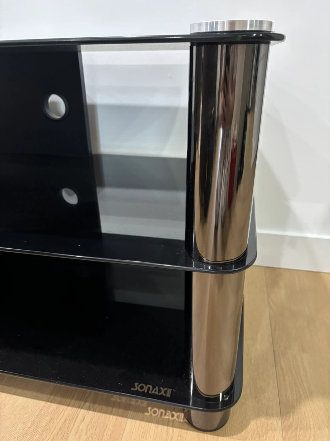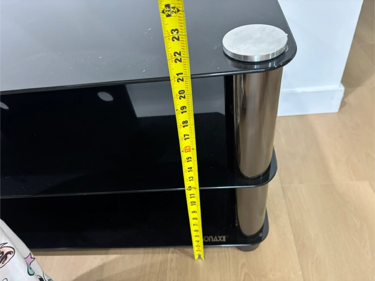 TV entertainment unit with black glass shelves and chrome-look pillars. It's a 3-shelf design. Unit measures approximately 50 inches wide and 21 inches high.