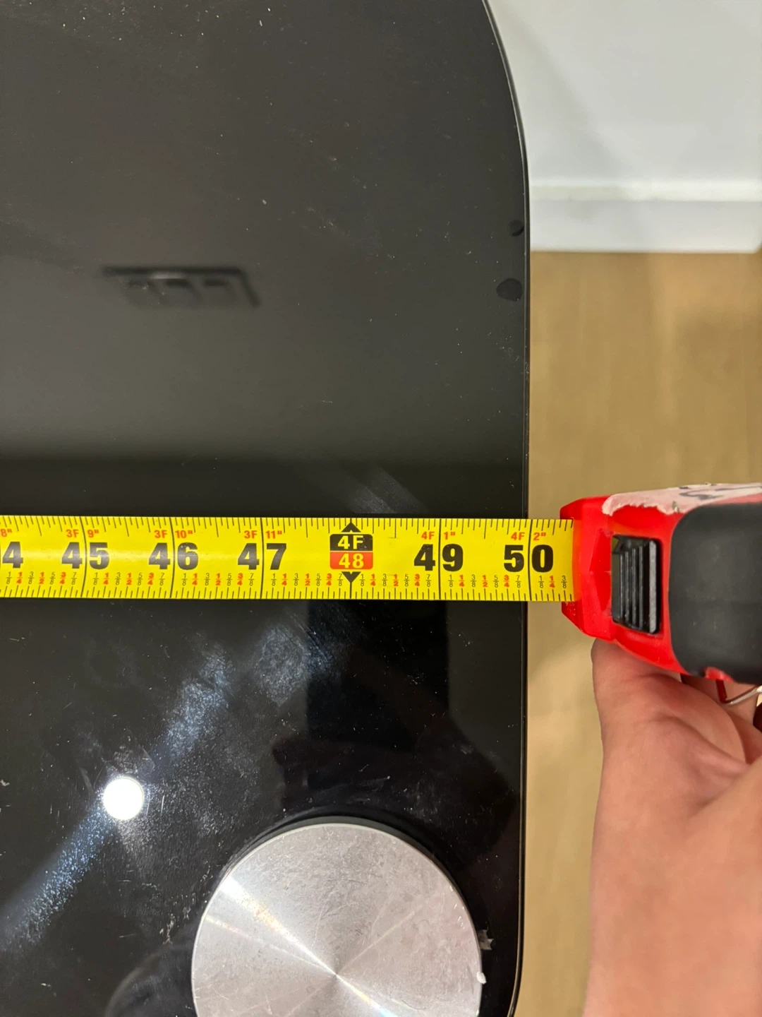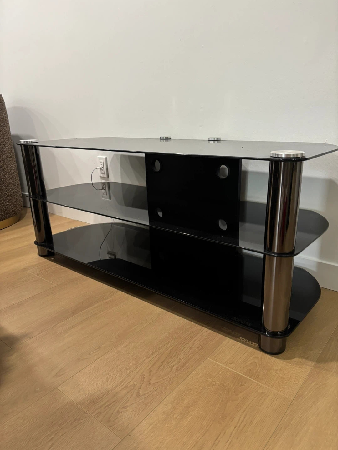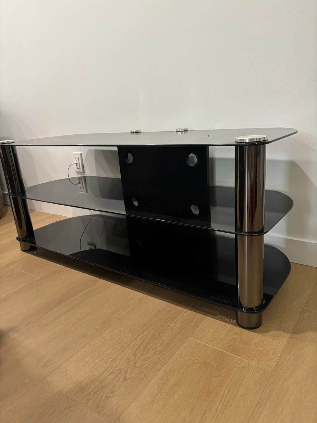 TV entertainment unit with black glass shelves and chrome-look pillars. It's a 3-shelf design. Unit measures approximately 50 inches wide and 21 inches high.