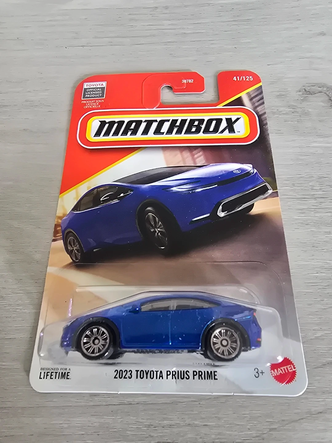 This is a blue Matchbox 1:64 scale die-cast model of the 2023 Toyota Prius Prime. It's officially licensed by Toyota and made by Mattel. Recommended for ages 3 and up.