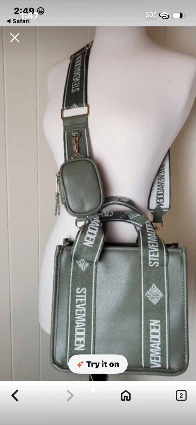 This is a cute olive green mini tote bag from Steve Madden. It comes with a matching detachable pouch and a crossbody strap. It's made of a faux leather material. Pick up cash only