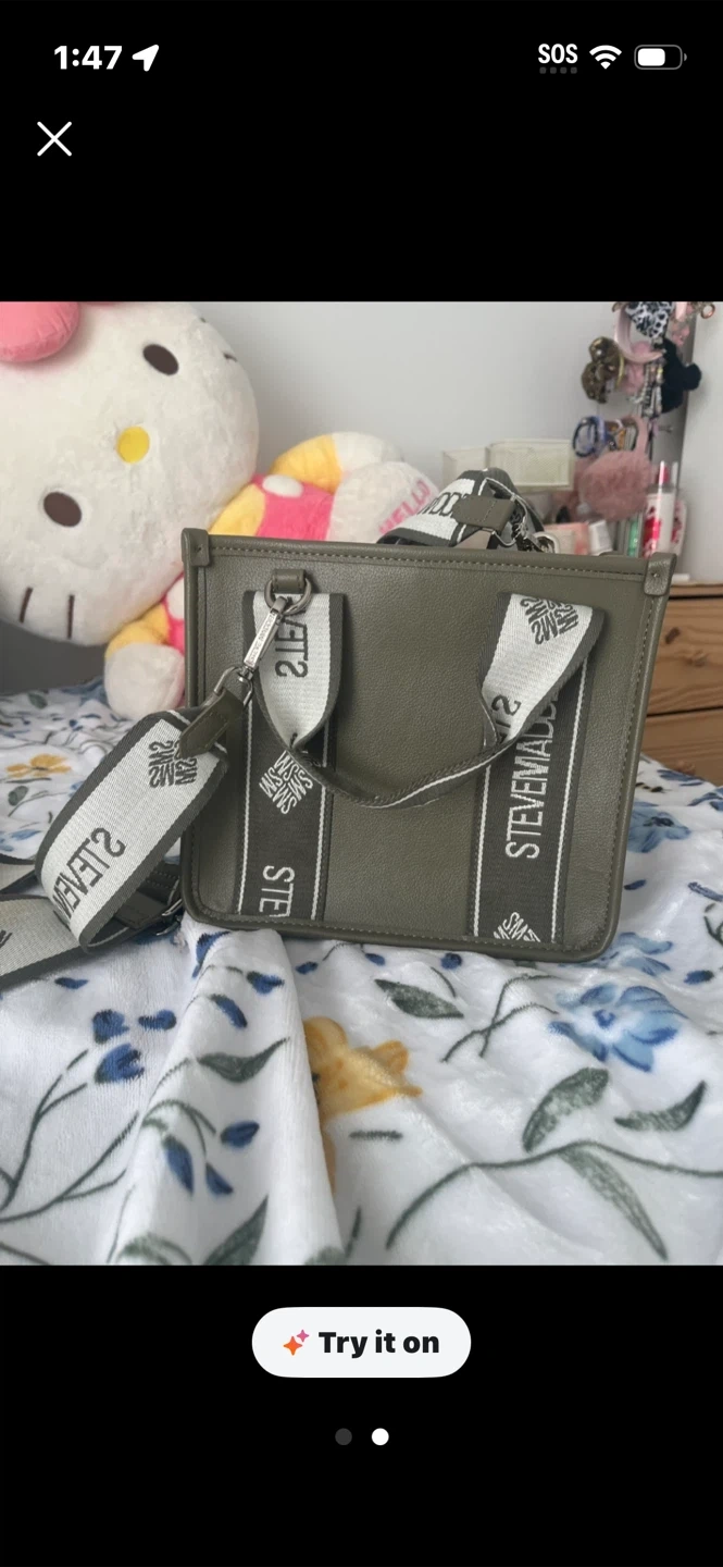 This is a cute olive green mini tote bag from Steve Madden. It comes with a matching detachable pouch and a crossbody strap. It's made of a faux leather material. Pick up cash only