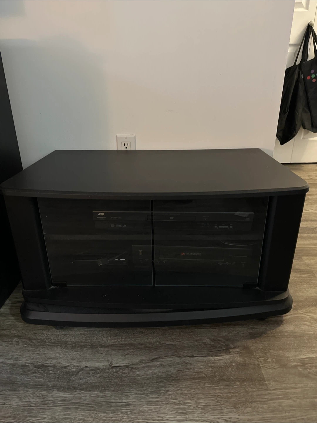 This black TV stand has a curved front and glass doors. It's a solid piece for organizing your media components. Great for keeping electronics tidy!