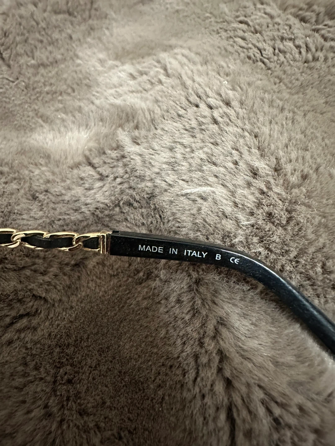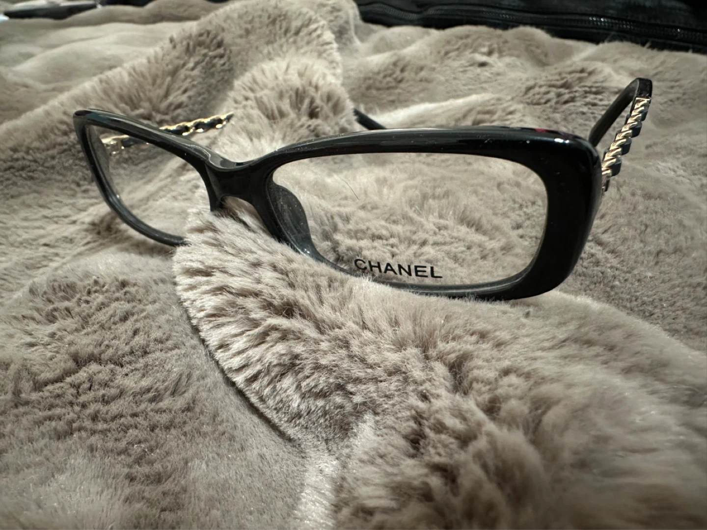 Classic black eyeglasses frames with gold chain detailing on the arms. Model number 3221-Q C.501. Made in Italy.