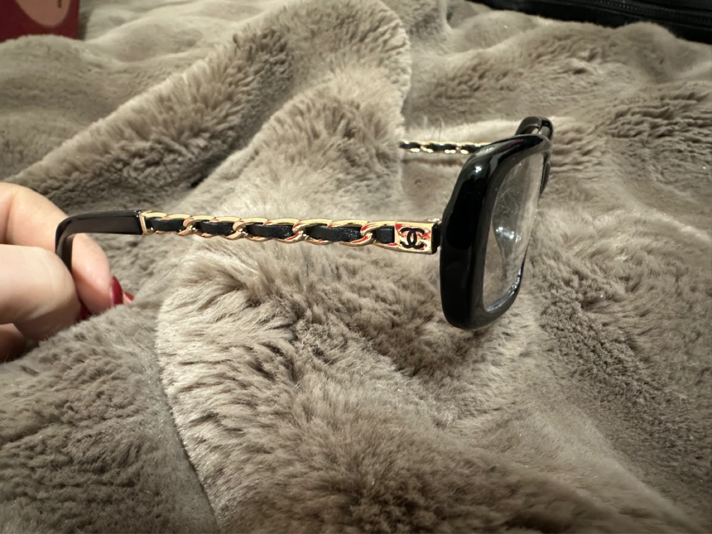 Classic black eyeglasses frames with gold chain detailing on the arms. Model number 3221-Q C.501. Made in Italy.