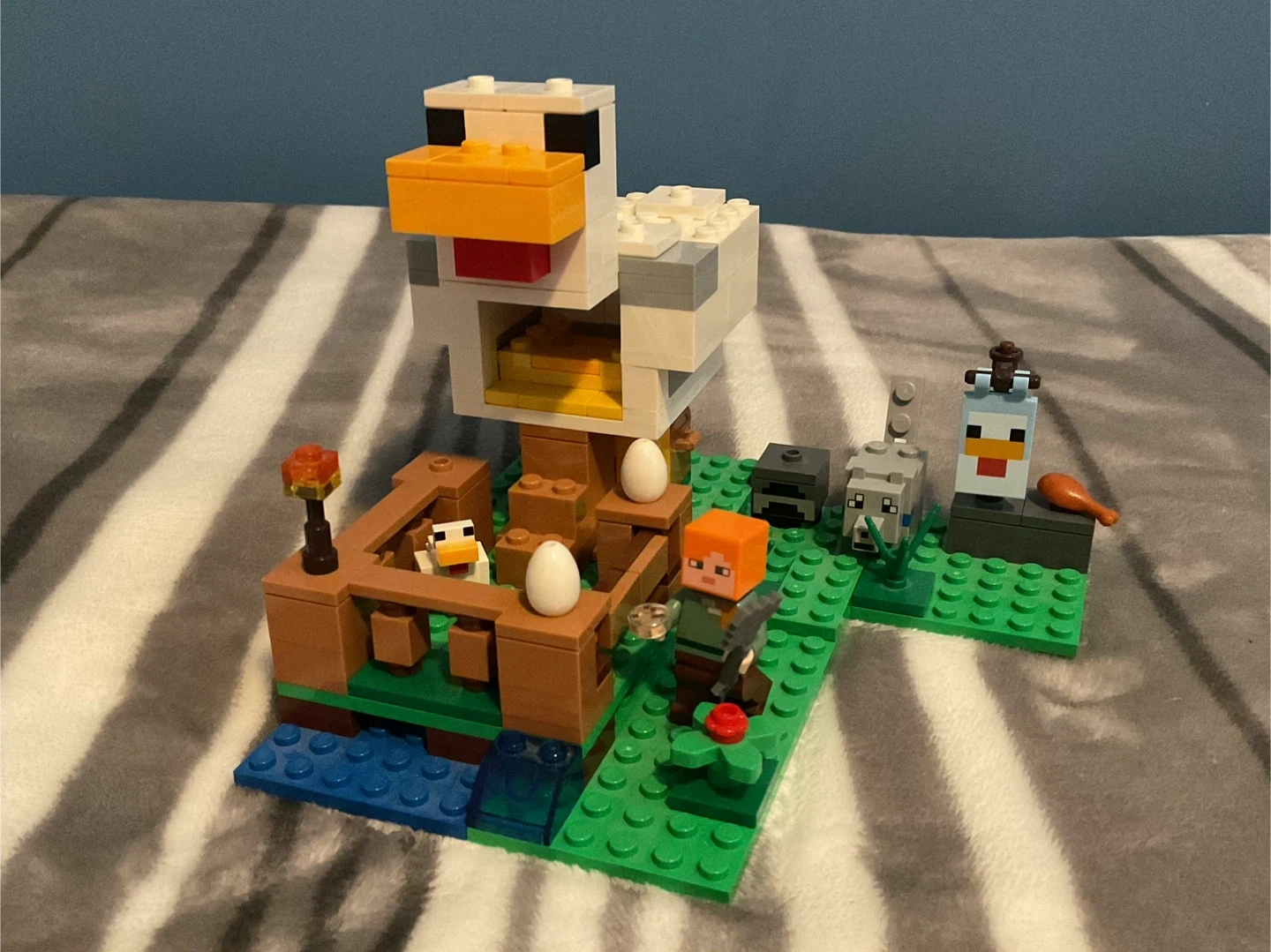 Lego set of a chicken coop from Minecraft. It includes the Alex minifig, 3 chickens, and wolf. All pieces are there, minus the spare part, but everything is there. Also comes with original instructions. Looking to get $25 cash please. Can take apart and put in ziplock bag upon request from buyer. Pickup in Oakwood Village. Thanks.