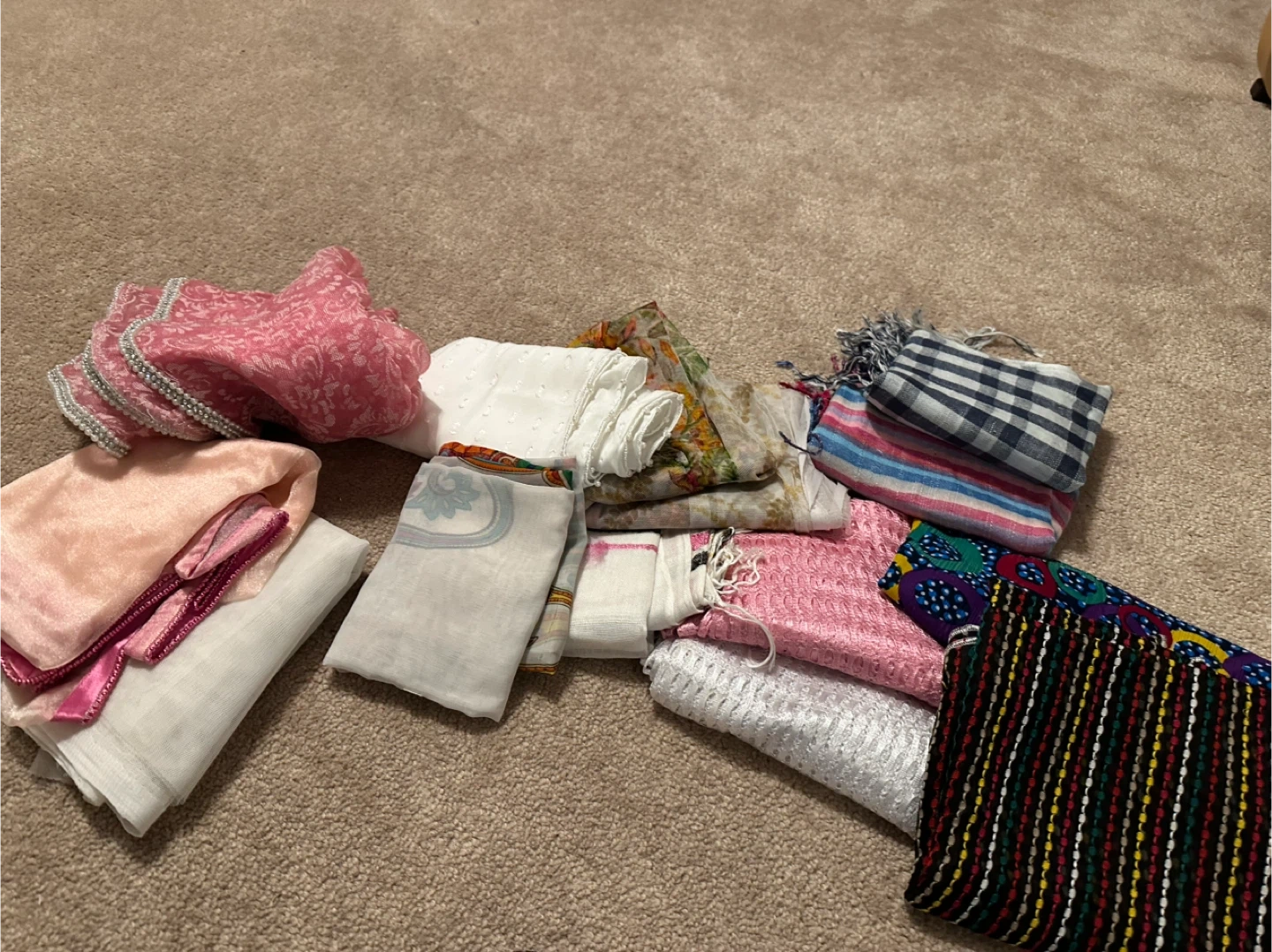 A collection of assorted scarves and decorative fabric pieces. Includes various patterns and colours. Perfect for crafting or as accents.
