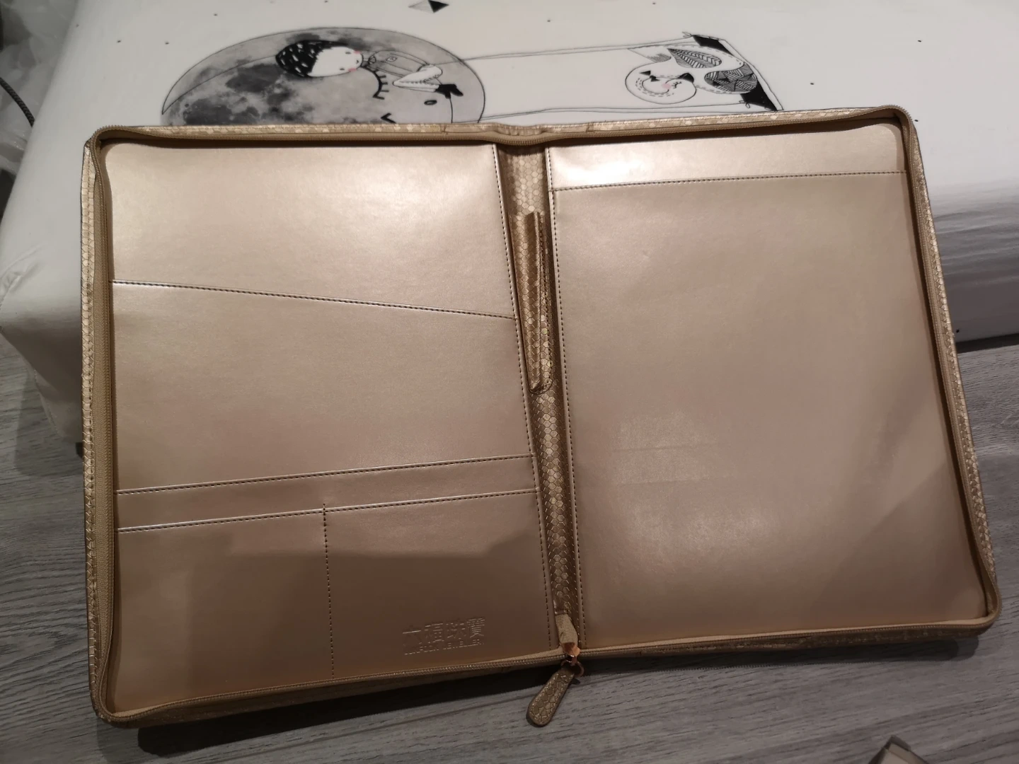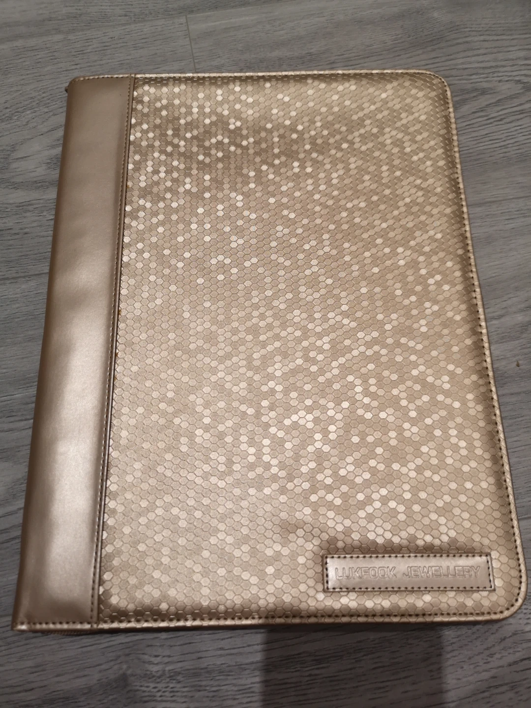This is a Lukfook Jewellery portfolio folder. It's a shiny gold colour with a textured hexagonal pattern on the outside and a smooth finish inside. It has multiple slots for documents.