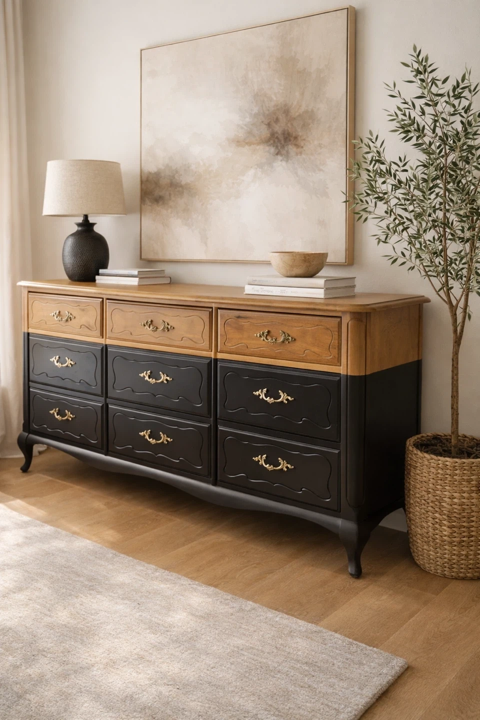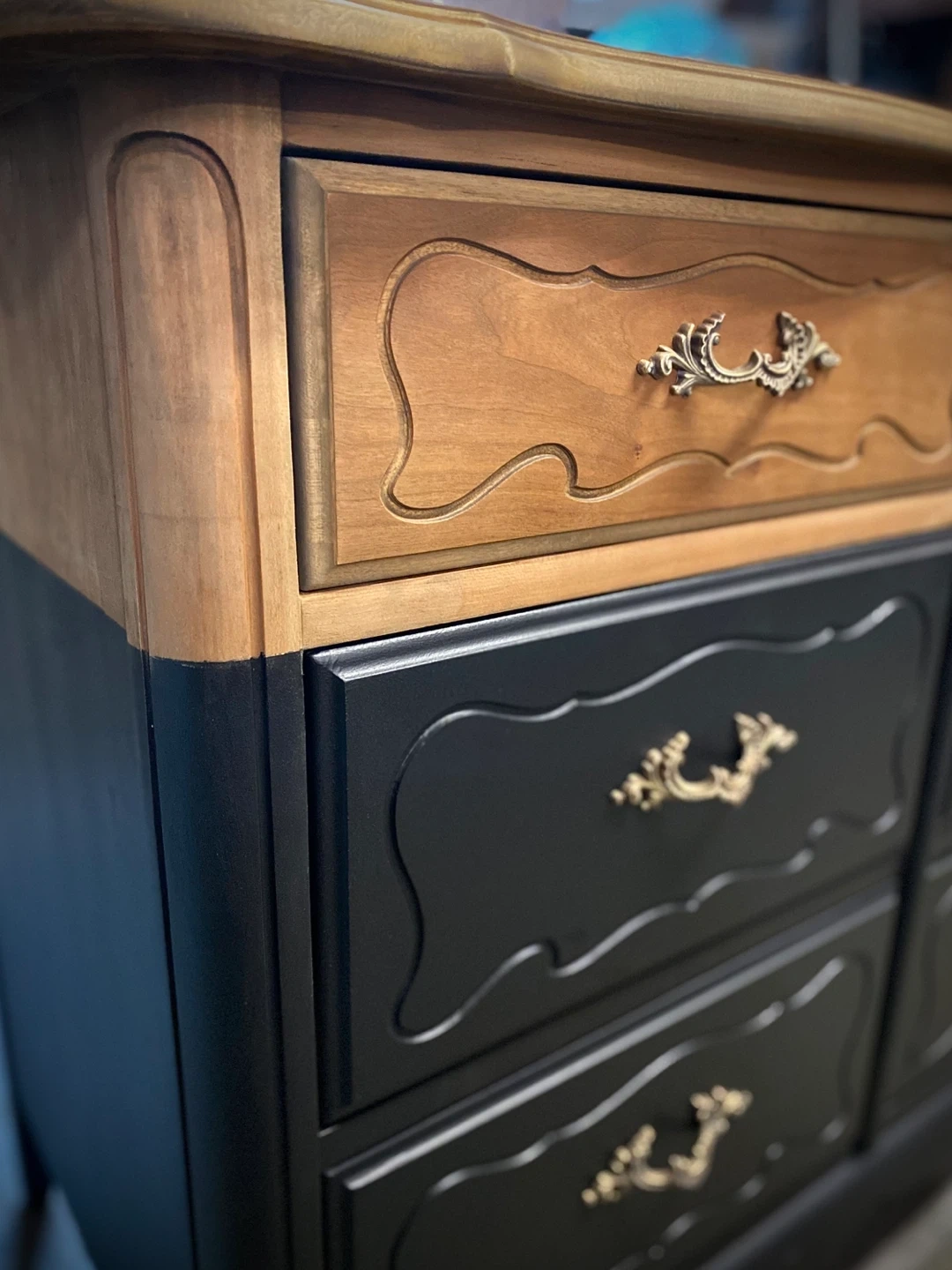 This piece pairs warm natural wood tones with a rich matte black body, creating depth, contrast, and sophistication. The original ornate brass hardware has been restored and polished, adding subtle elegance without overpowering the clean, updated look.