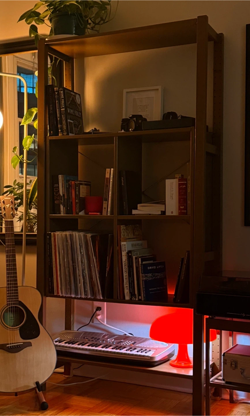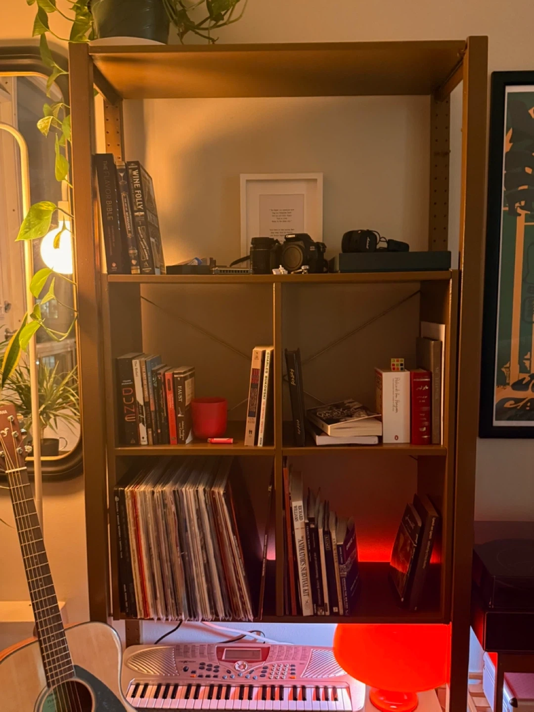 A sturdy wooden bookshelf with multiple shelves, perfect for books and vinyl records. It's a great piece for organizing your collection and adding a touch of style to your living space. Dimensions: 70 inches tall, 30 inches wide, 12 inches deep.