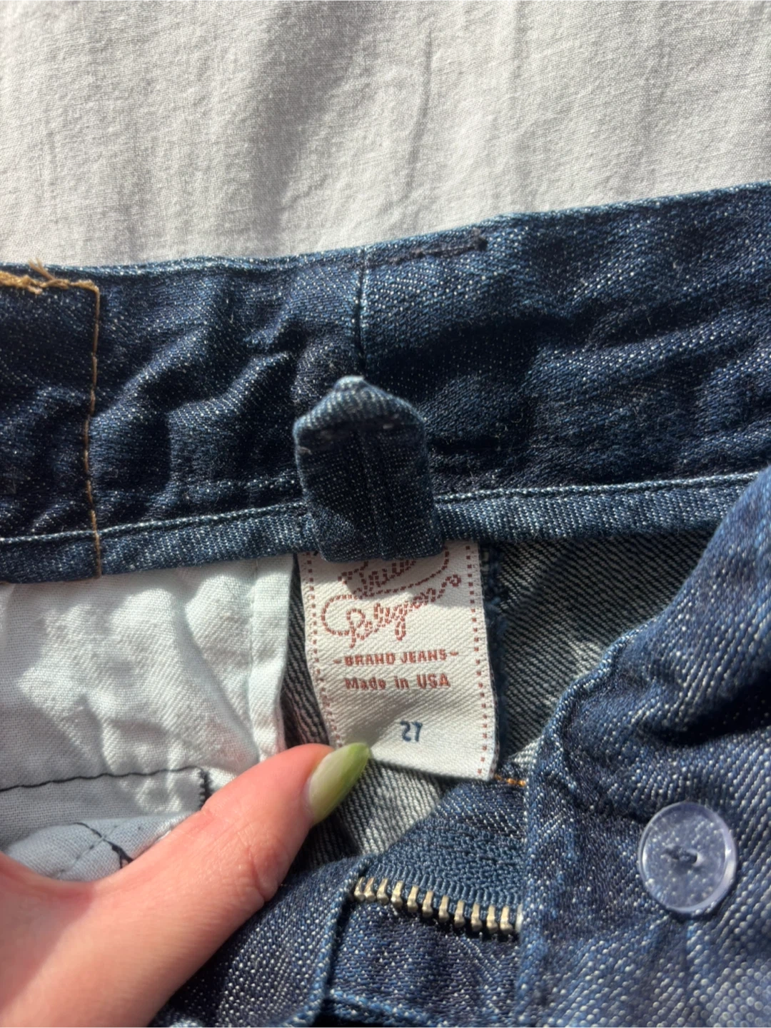 These are True Religion denim shorts in a size 27. They're a classic blue denim with a raw hem.