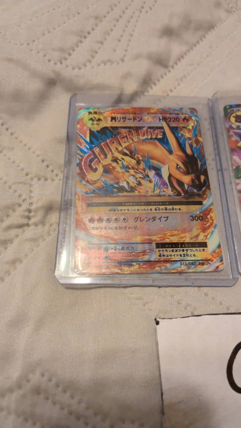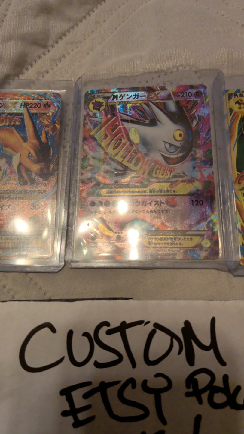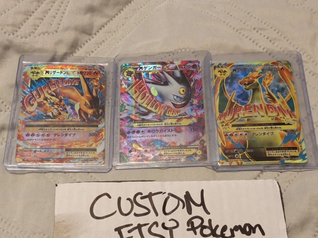 This lot includes three Pokemon cards: M Charizard EX, Gengar EX, and another M Charizard EX. These cards are in protective sleeves. Great for collectors! Custom made with texturing on it
