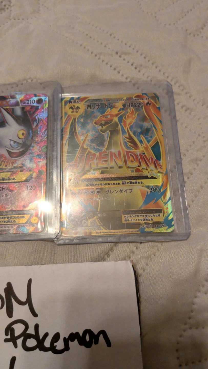 This lot includes three Pokemon cards: M Charizard EX, Gengar EX, and another M Charizard EX. These cards are in protective sleeves. Great for collectors! Custom made with texturing on it
