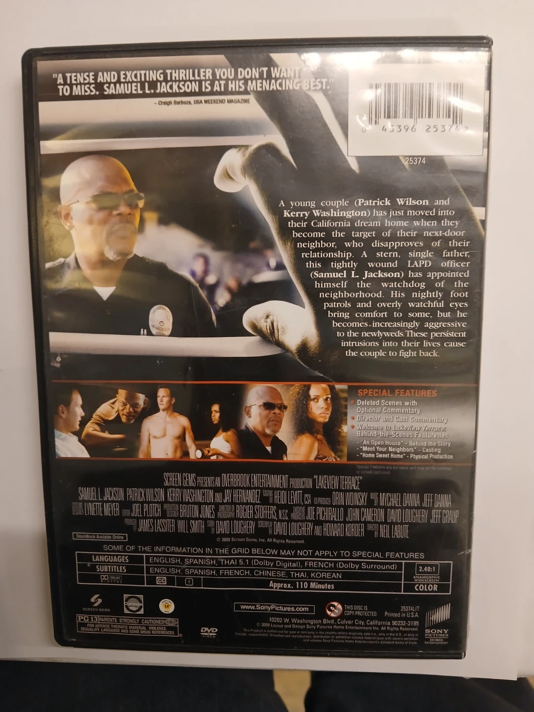 This DVD features the movie Lakeview Terrace starring Samuel L. Jackson. The runtime is approximately 110 minutes. Includes English, Spanish, French, and Chinese audio and subtitle options.