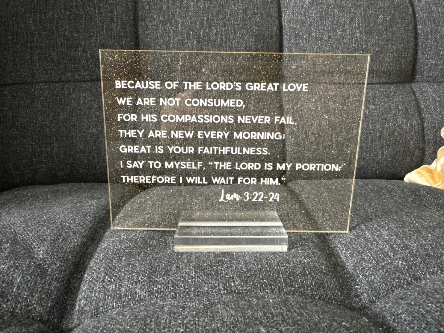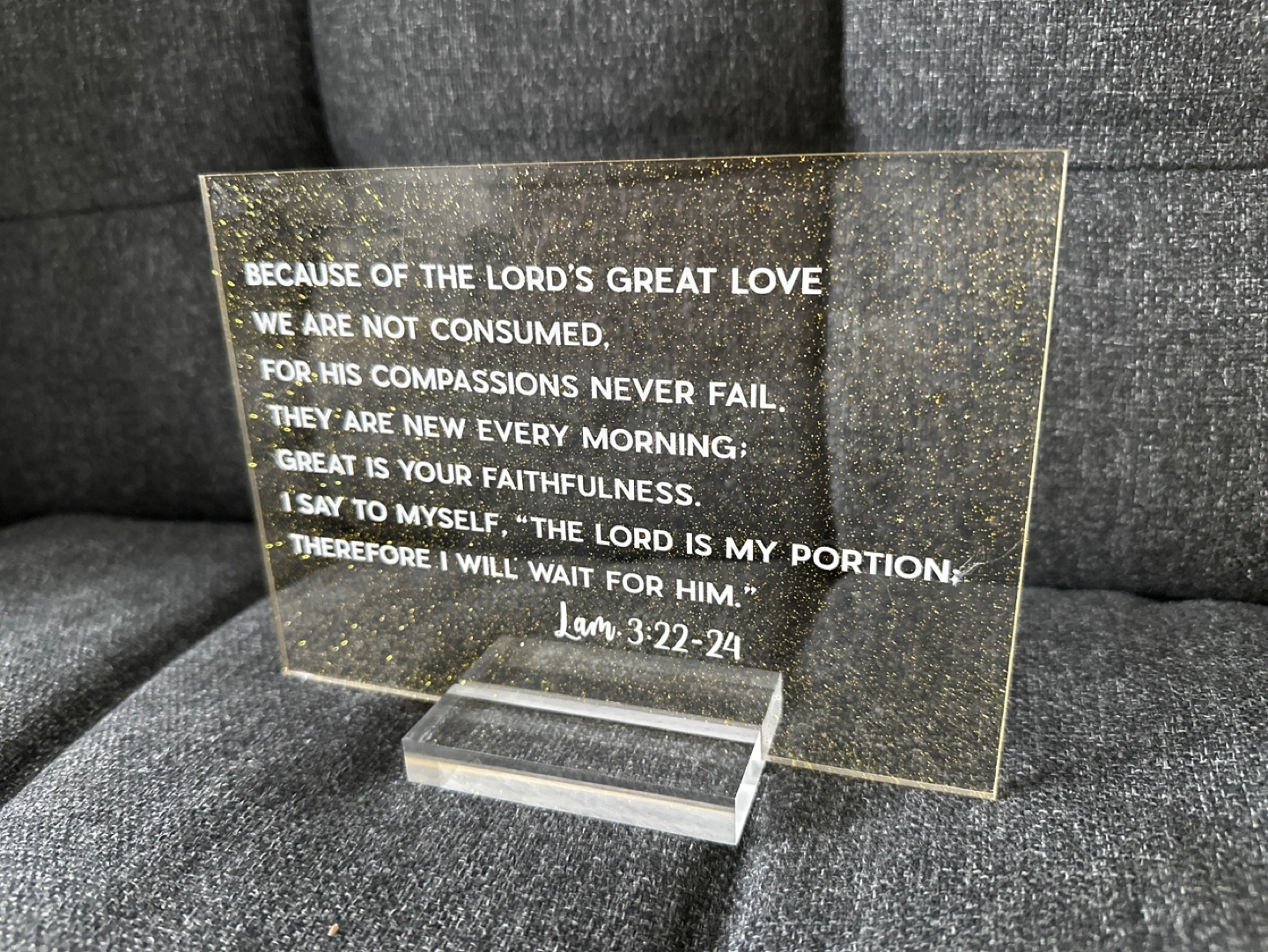 Beautiful gold glitter acrylic plaque. Features a bible verse from Lamentations 3:22-24. Clear acrylic stand included. Perfect for home décor or gift.