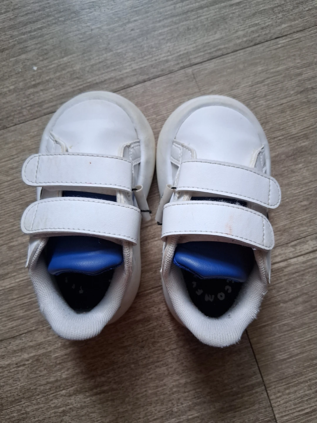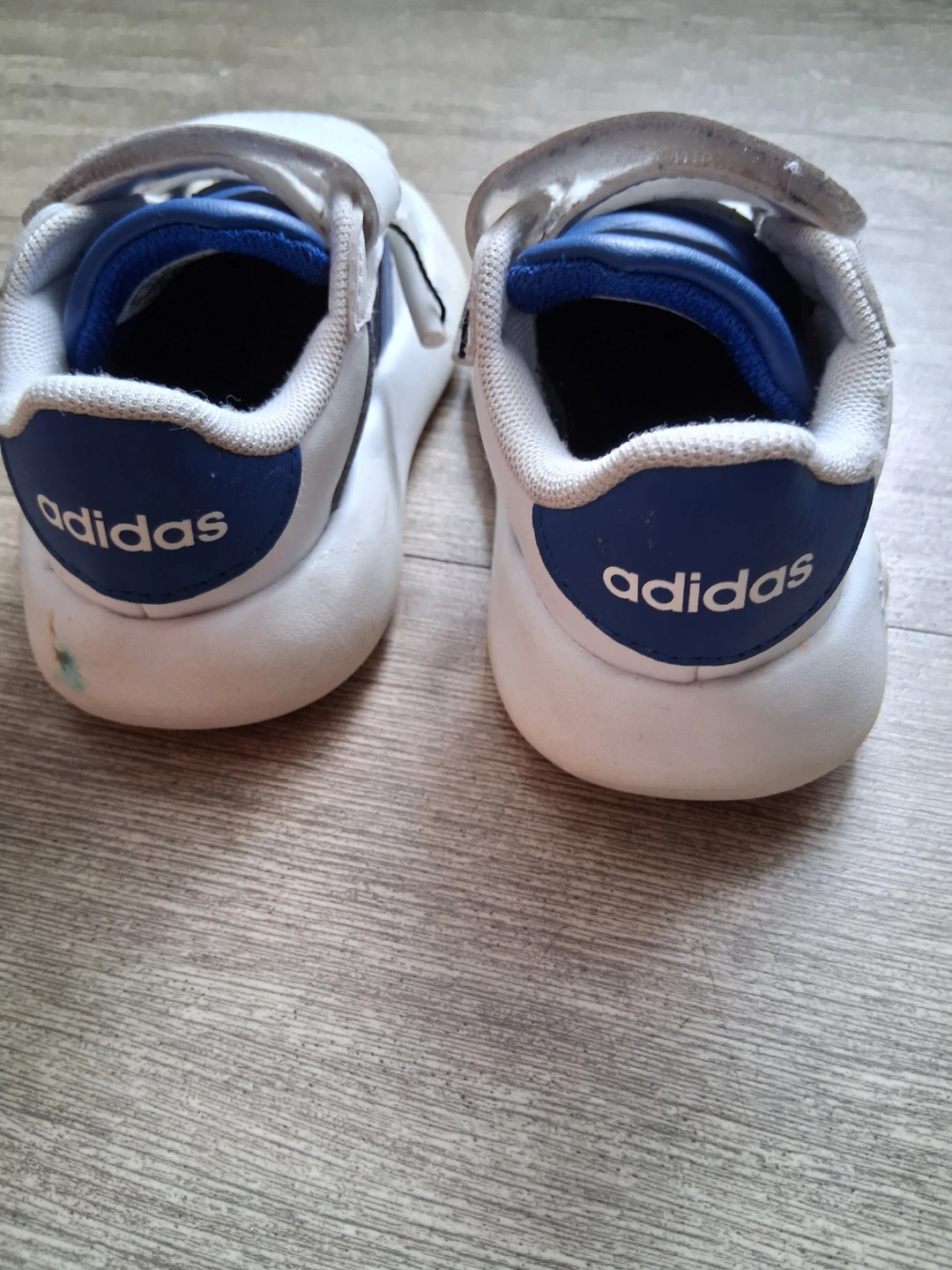 Adidas sneakers in white and blue. Features hook-and-loop closures for easy on and off. Perfect for little ones starting to walk! Size 6 for baby and toddler. My baby grow out of it.
