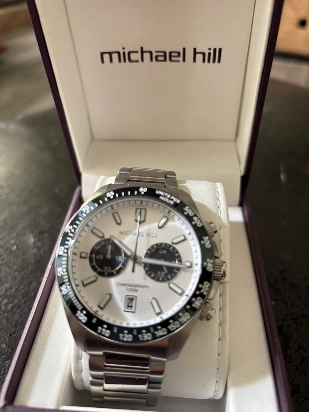 Men's chronograph wristwatch. Stainless steel band. White face. Comes in original box.