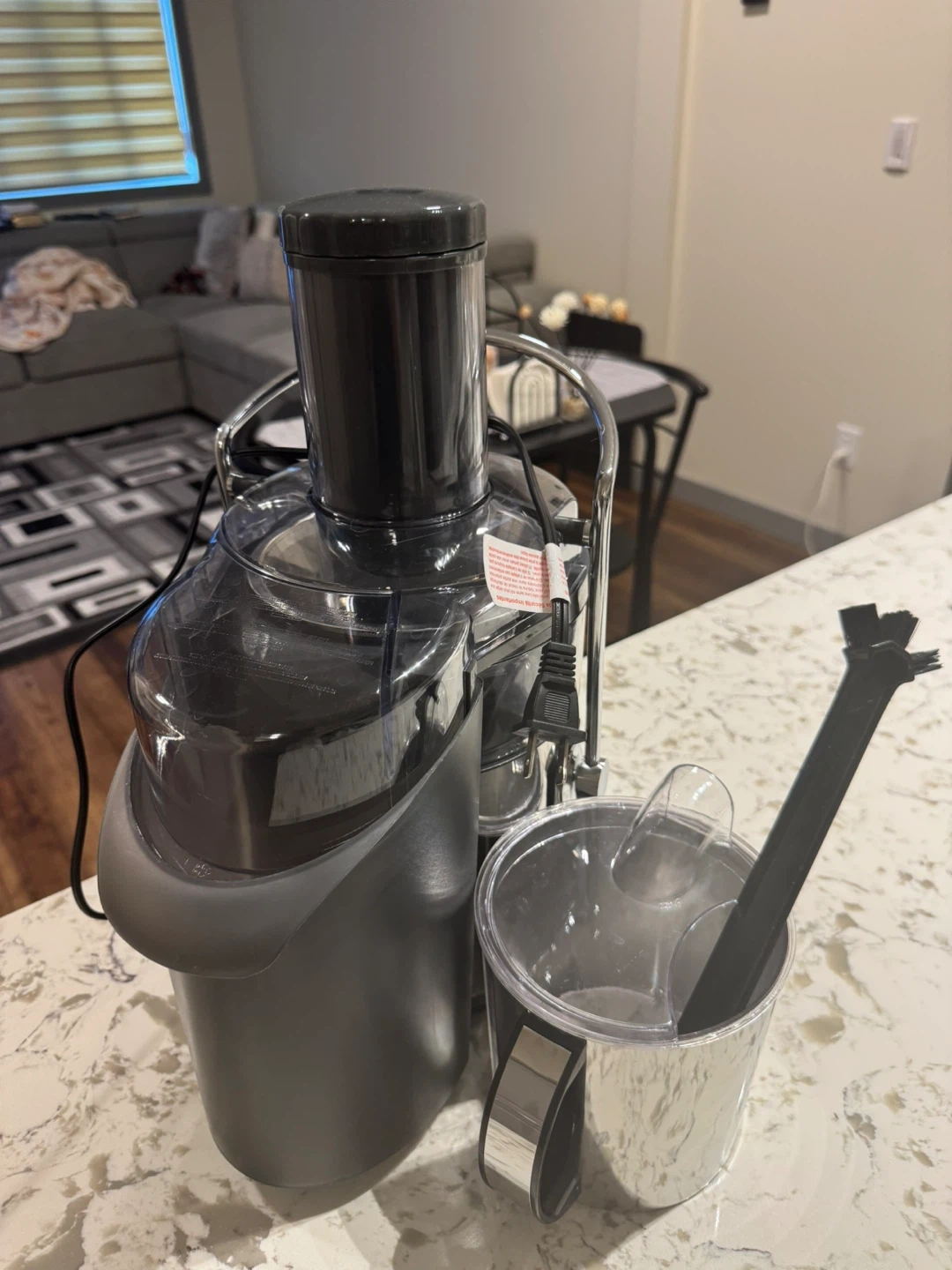 This is a Bella 5 speed digital juicer. It has a plastic and metal design. Includes a brush for cleaning.