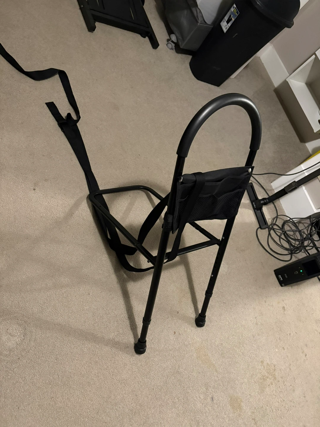 This black bed rail assist handle provides support for getting in and out of bed. It's made of durable metal with a padded grip. Includes straps for securing to the mattress.