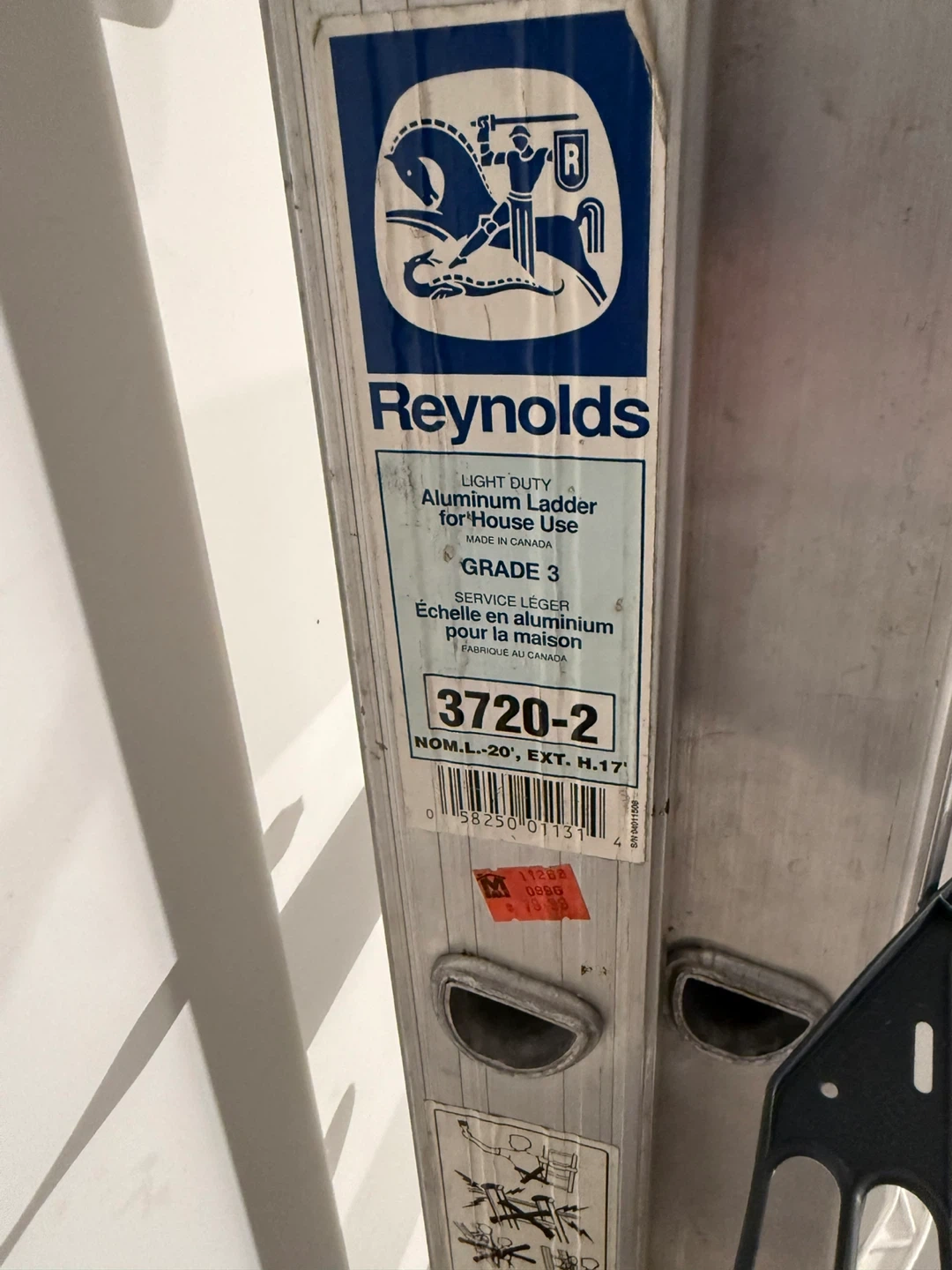 Buy & SellReynolds Aluminum LadderReynolds Aluminum Ladder$130Reynolds light duty aluminum ladder for house use. Model 3720-2, nominal length 20 feet, extended height 17 feet. Made in Canada.WHERE TO MEETCheck LocationView MapSELLERMeWestdale181 review0 chats·0 favorites·8 viewsSEND CHAT TO SELLERHi Me! I’m interested in your listing.Hi Me! I’m interested in your listing.Get the Karrot app to chatSign In to chat