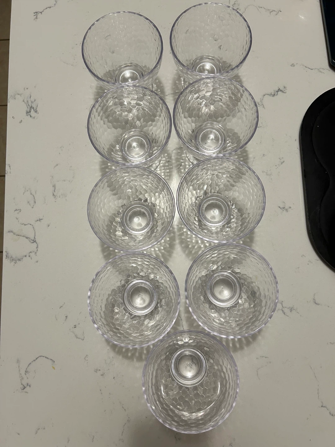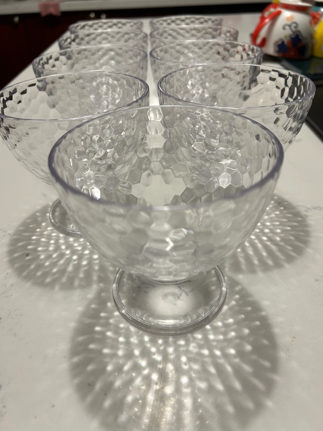 This is a set of nine clear dessert cups with a textured finish. They're made of durable plastic and feature a pedestal base. These cups are suitable for serving ice cream, parfaits, or other small desserts. They're perfect for parties or everyday use!