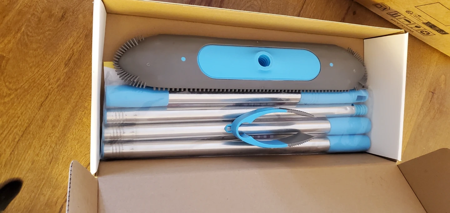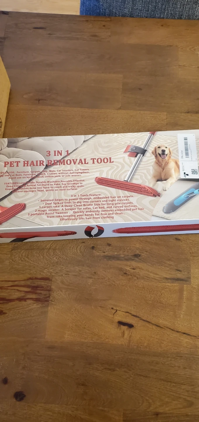This 3-in-1 pet hair removal tool.. It comes with an adjustable extension pole for easy reach. The tool's serrated edges and rubber bristles effectively grab embedded pet hair from carpets and furniture.