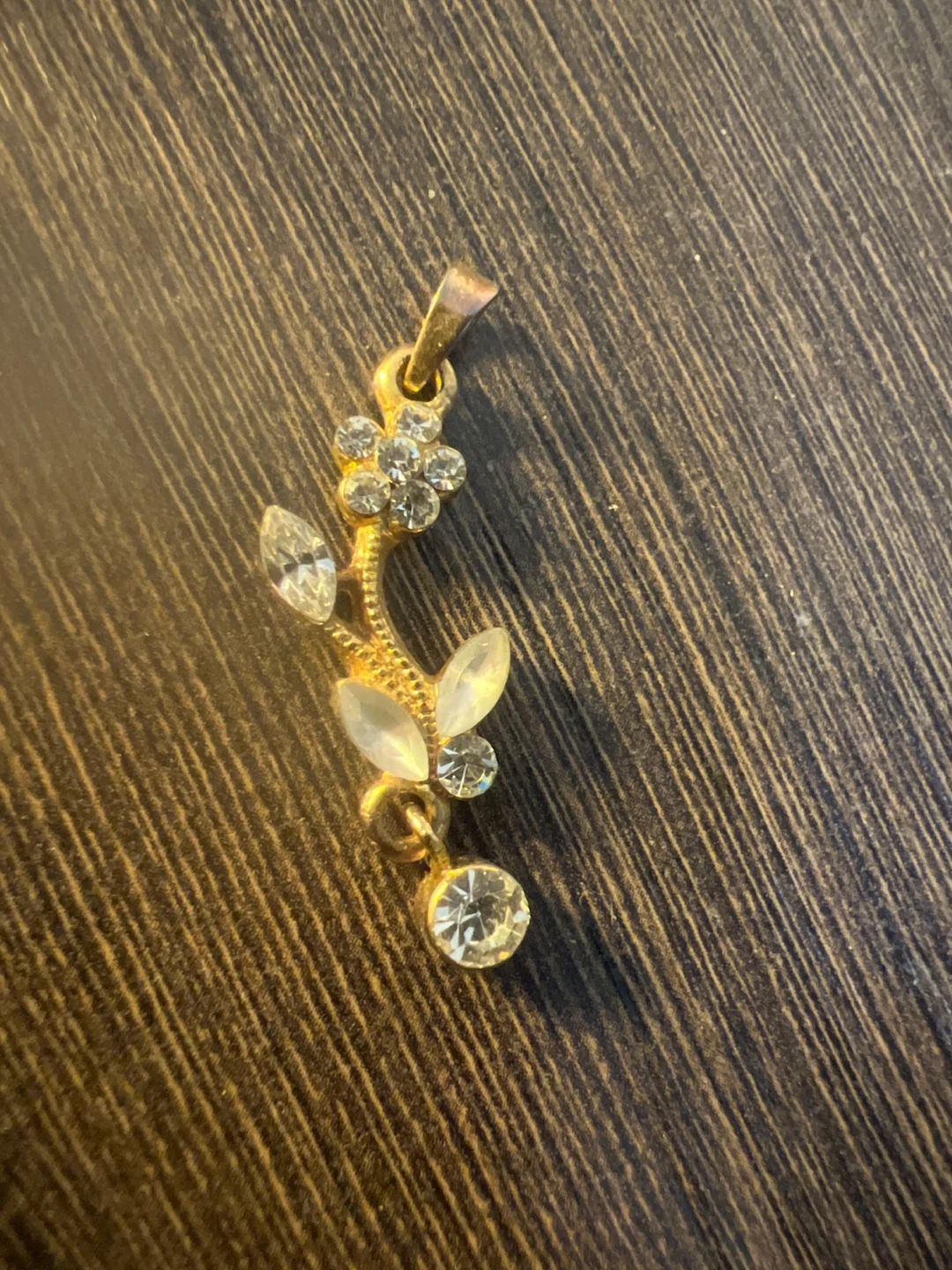 Selling a cute gold-tone pendant with a floral design. It features sparkling clear stones that catch the light beautifully. Perfect for adding a touch of elegance to any outfit!