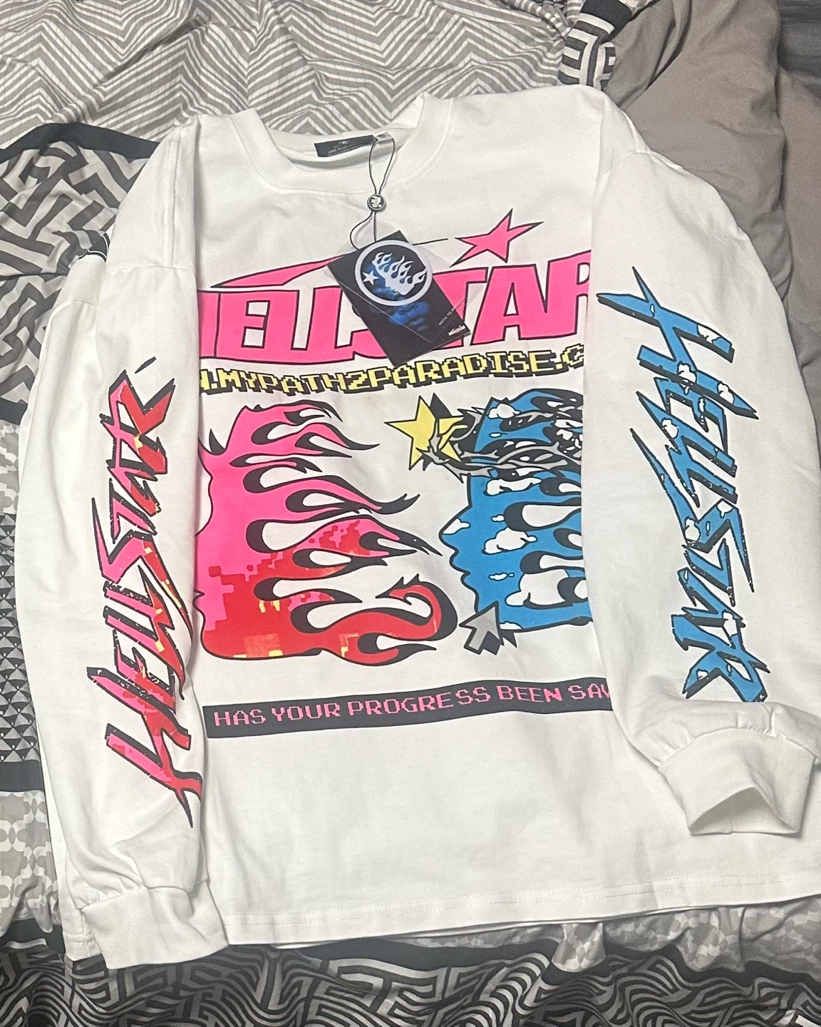 HELLSTAR long sleeve graphic t-shirt in white. Features "HELLSTAR" text on sleeves and front graphic with flames and celestial imagery. "HAS YOUR PROGRESS BEEN SAVED" text also visible. It's made of cotton.