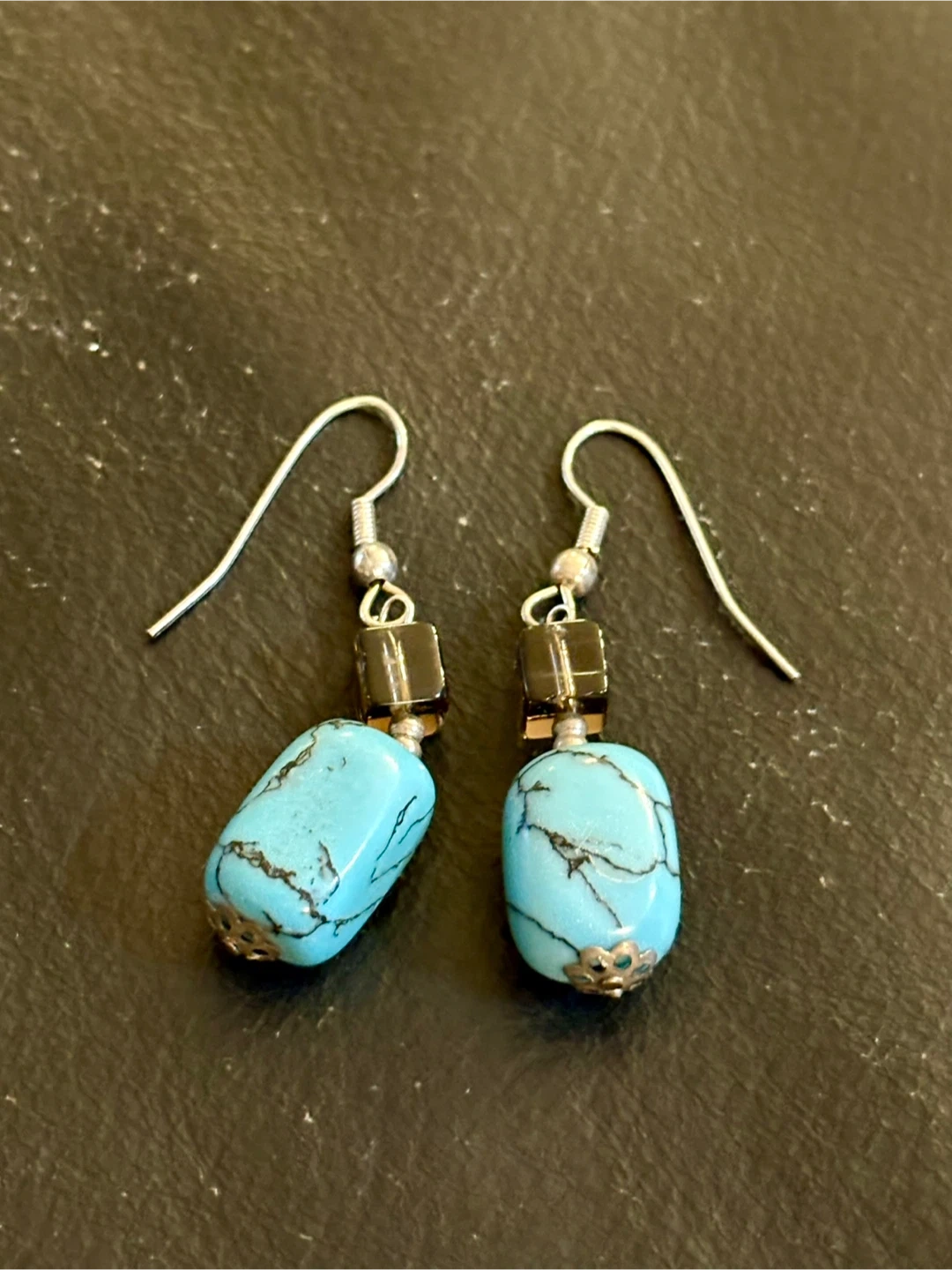 These earrings feature a pair of bright blue, nugget-shaped turquoise beads with black matrix. A small, faceted brown bead sits above each turquoise stone, suspended from a silver-tone hook. These would add a pop of colour to any outfit!