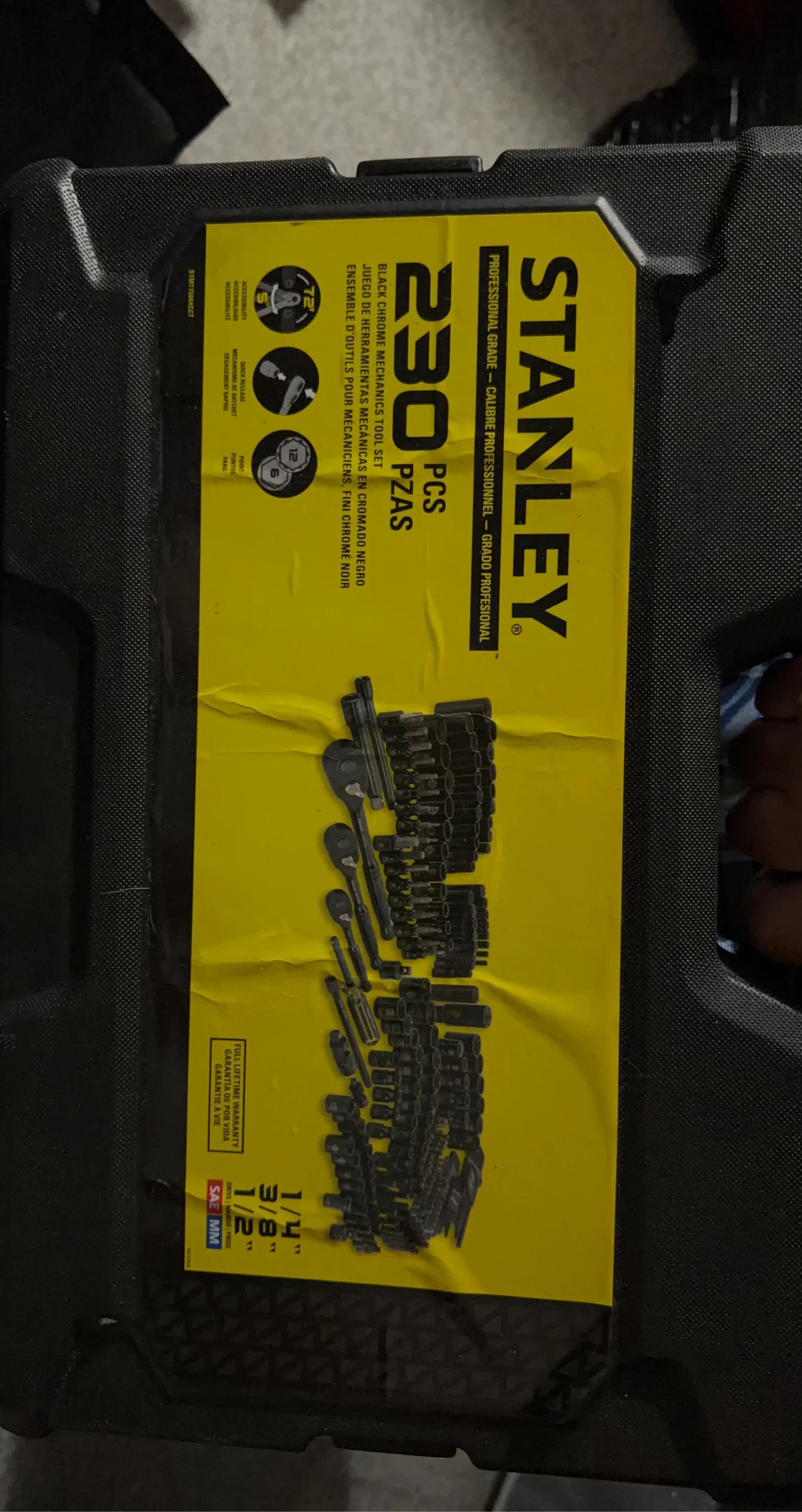This is a Stanley 230-piece black chrome mechanics tool set. It includes a quick-release ratchet mechanism. Drive sizes are 1/4", 3/8", and 1/2".