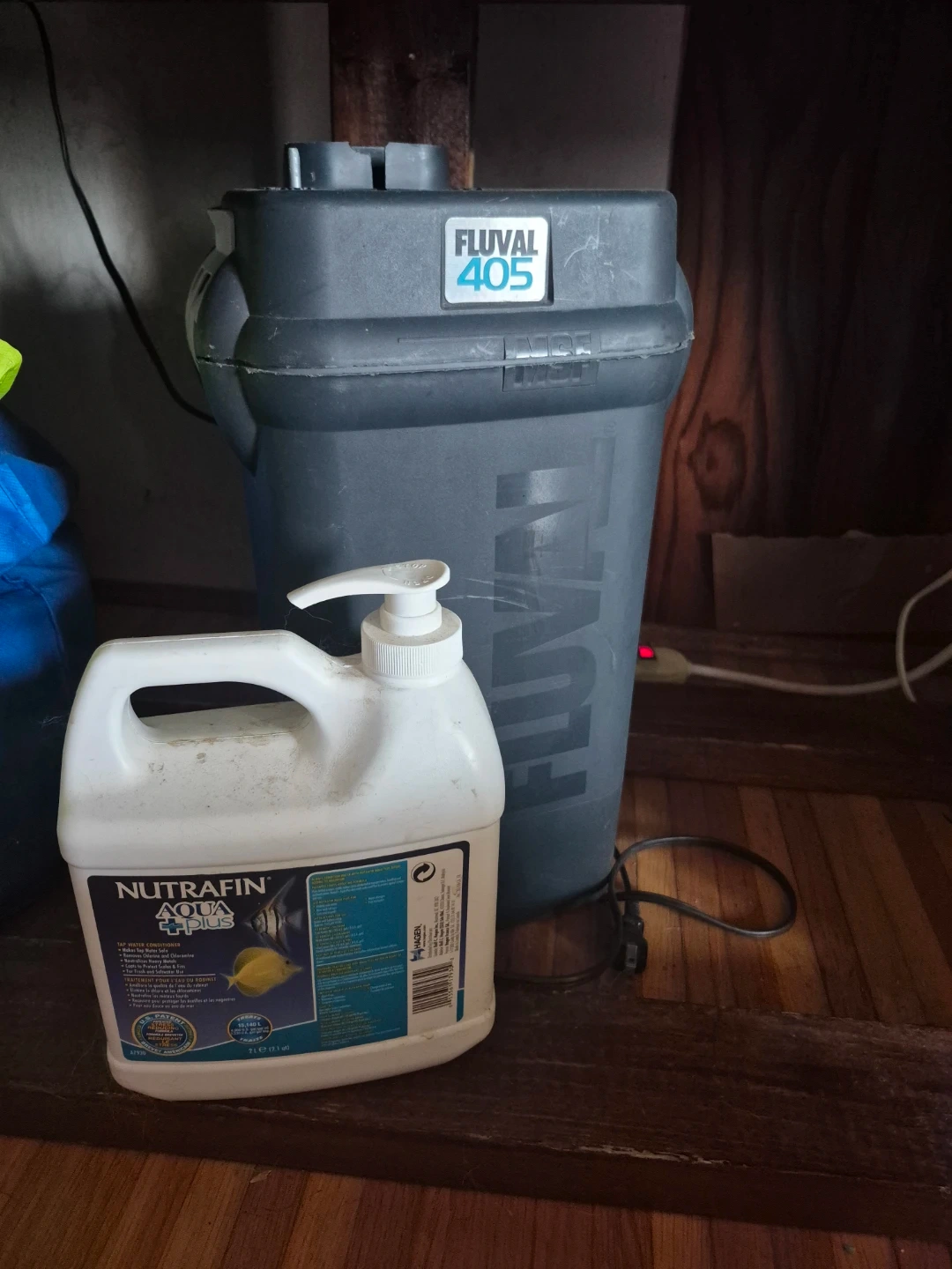 This listing includes a Fluval Aqua-Stop 405 filter and a large bottle of Nutrafin Aqua Plus water conditioner. The filter is grey and comes with all necessary tubing. The conditioner is a 2.5 L jug. It's perfect for setting up or maintaining a freshwater aquarium.