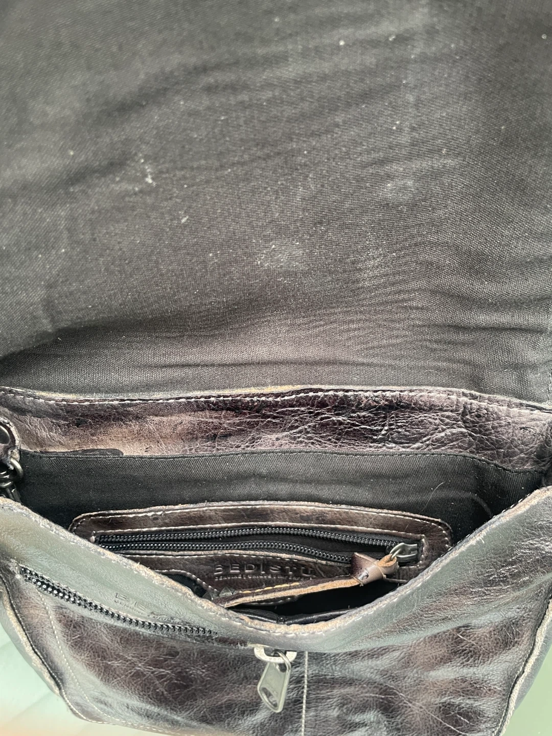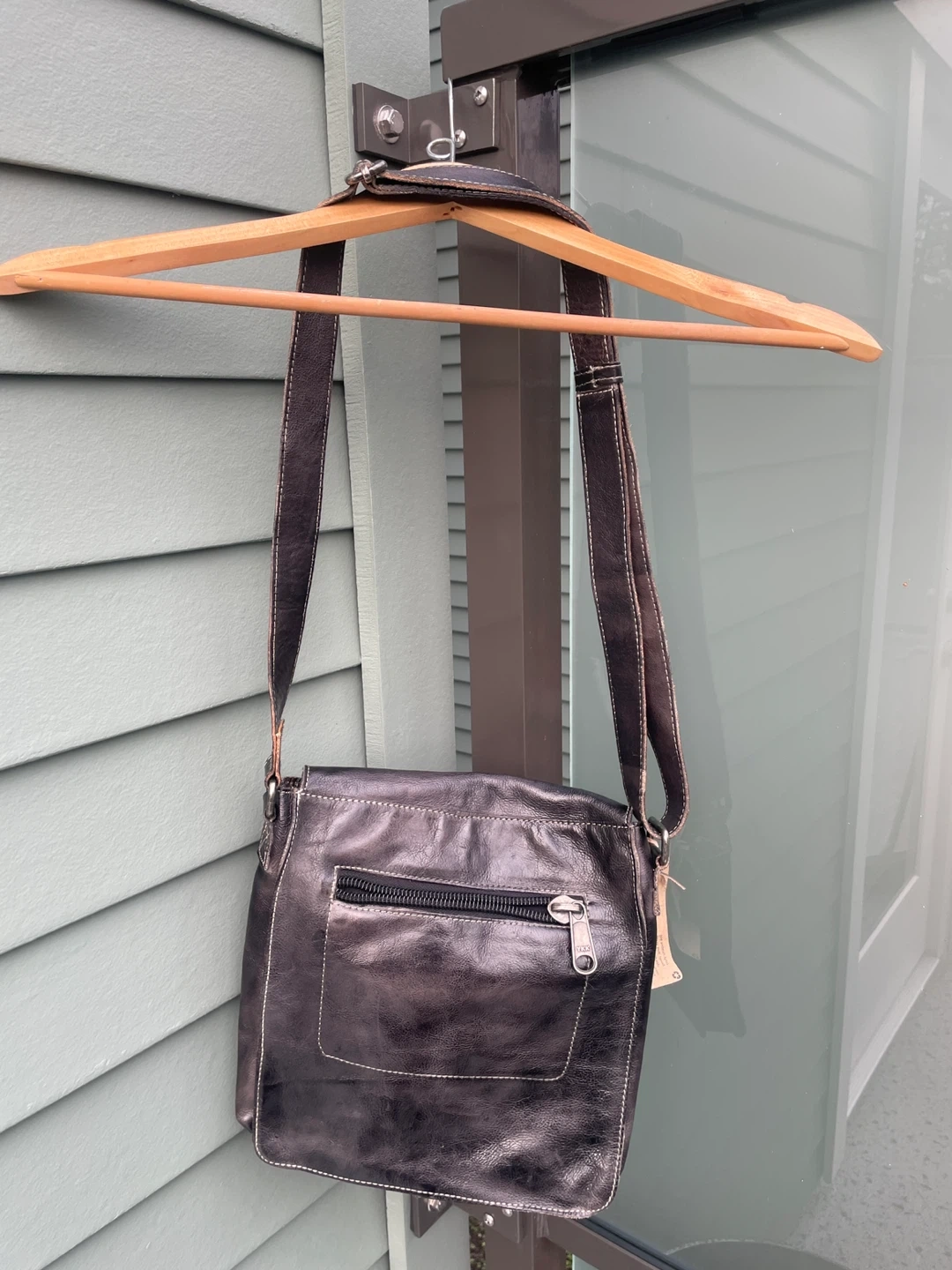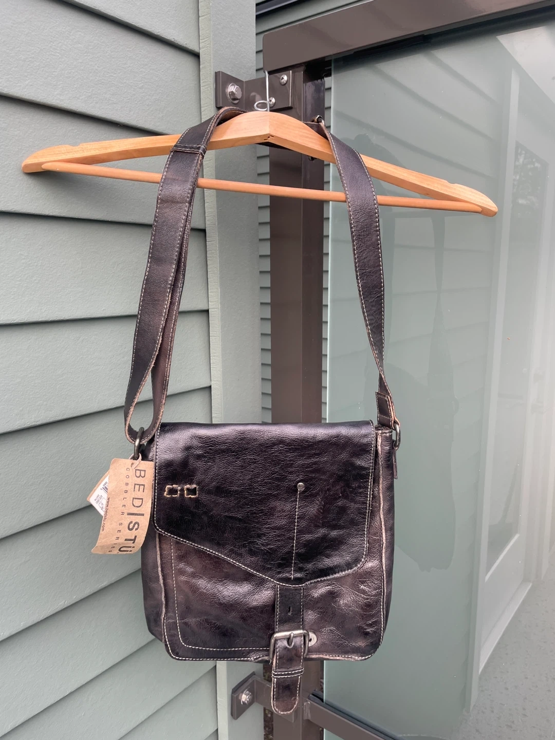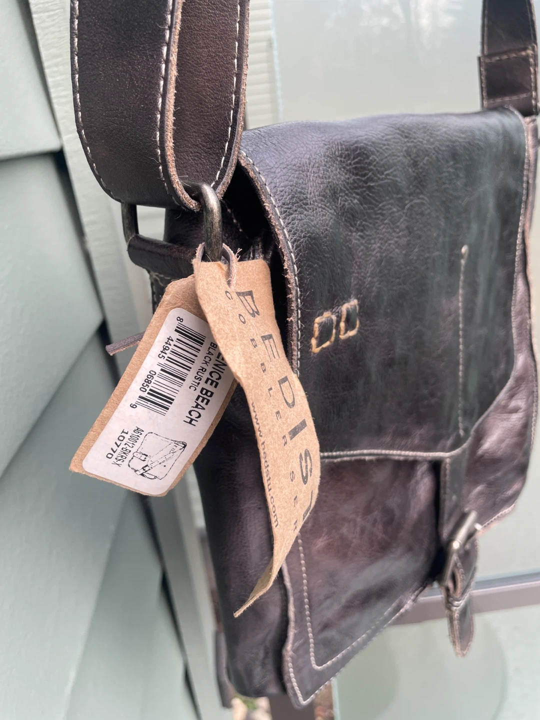 This is a Bed Stu crossbody bag in a black rustic leather. It's a stylish and durable bag that's perfect for everyday use. The bag features a buckle closure and a zipper pocket inside. 10.5” x 9” brand new