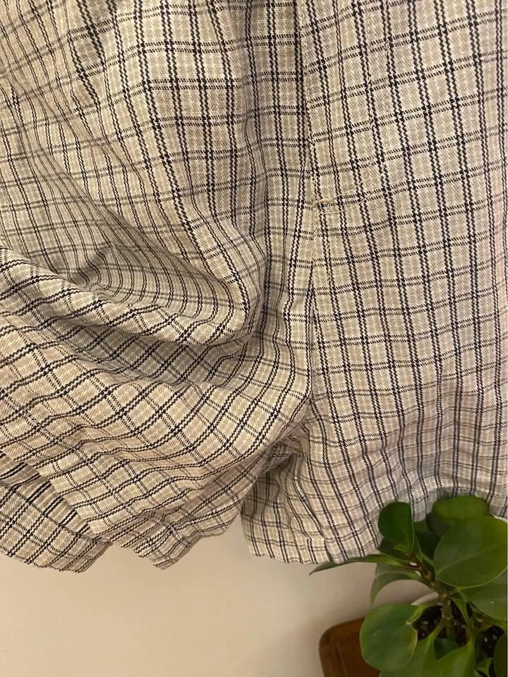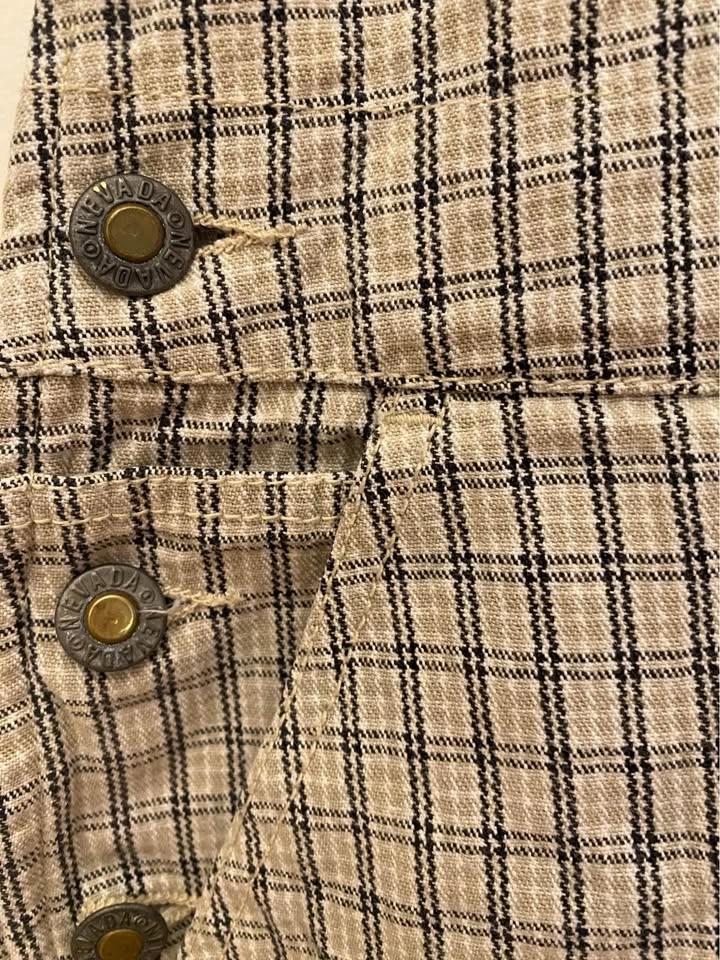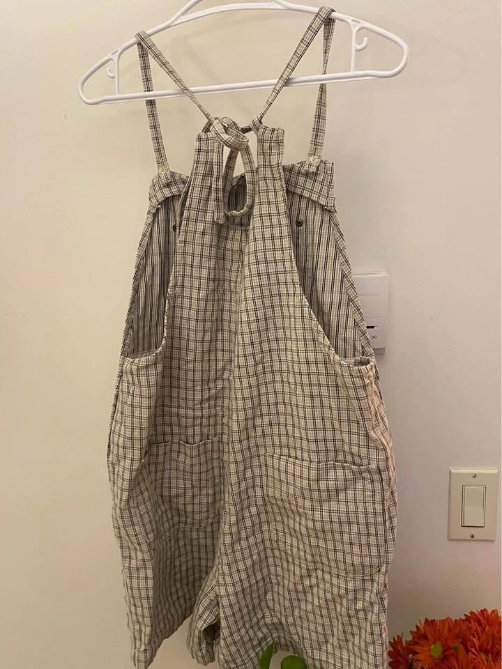 Women’s Nevada vintage short overalls. They say size 12 but more of a US 6/8 medium or oversized small. It’s a checkered pattern that is sort of sage green and black but in other lights the sage looks grey.