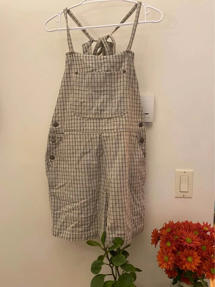 Women’s Nevada vintage short overalls. They say size 12 but more of a US 6/8 medium or oversized small. It’s a checkered pattern that is sort of sage green and black but in other lights the sage looks grey.