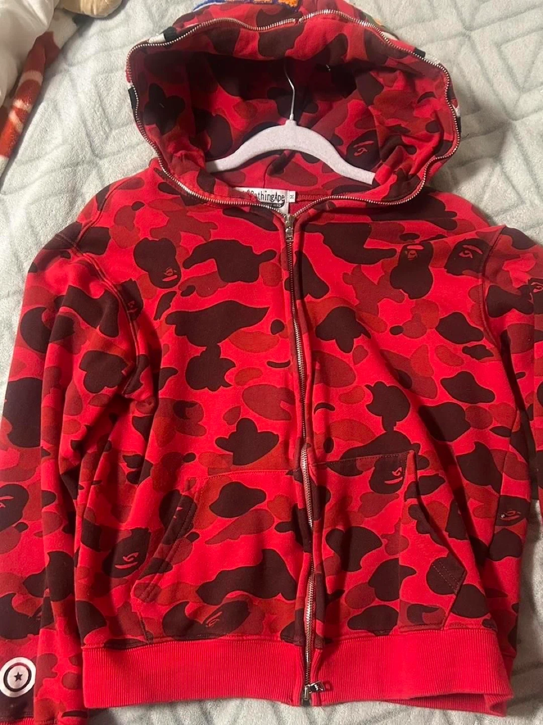 This BAPE hoodie features the iconic red camo pattern with a shark graphic on the hood. It's a full zip closure. Real one you can check if we link