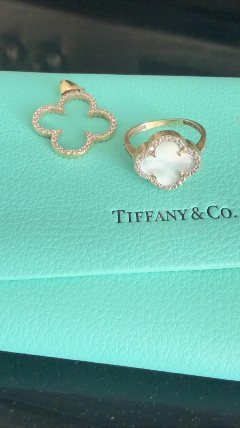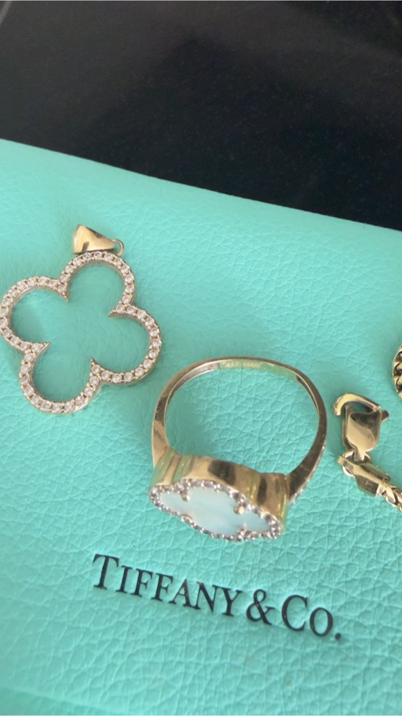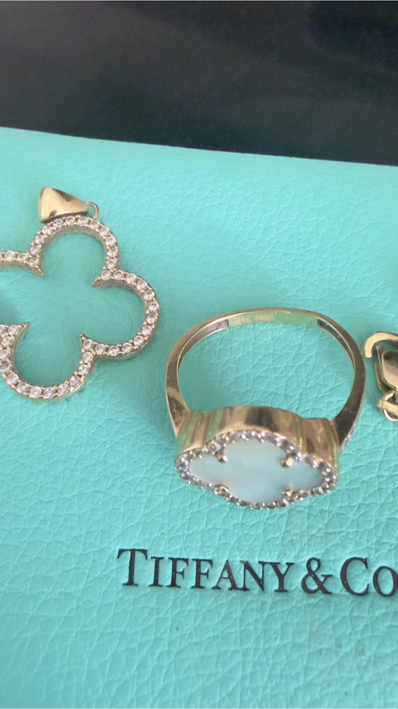 This listing includes a Tiffany & Co. eyewear case in their signature teal colour. Also shown are various jewellery pieces including rings, a pendant, and a gold chain, all on top of a Tiffany & Co. branded box.