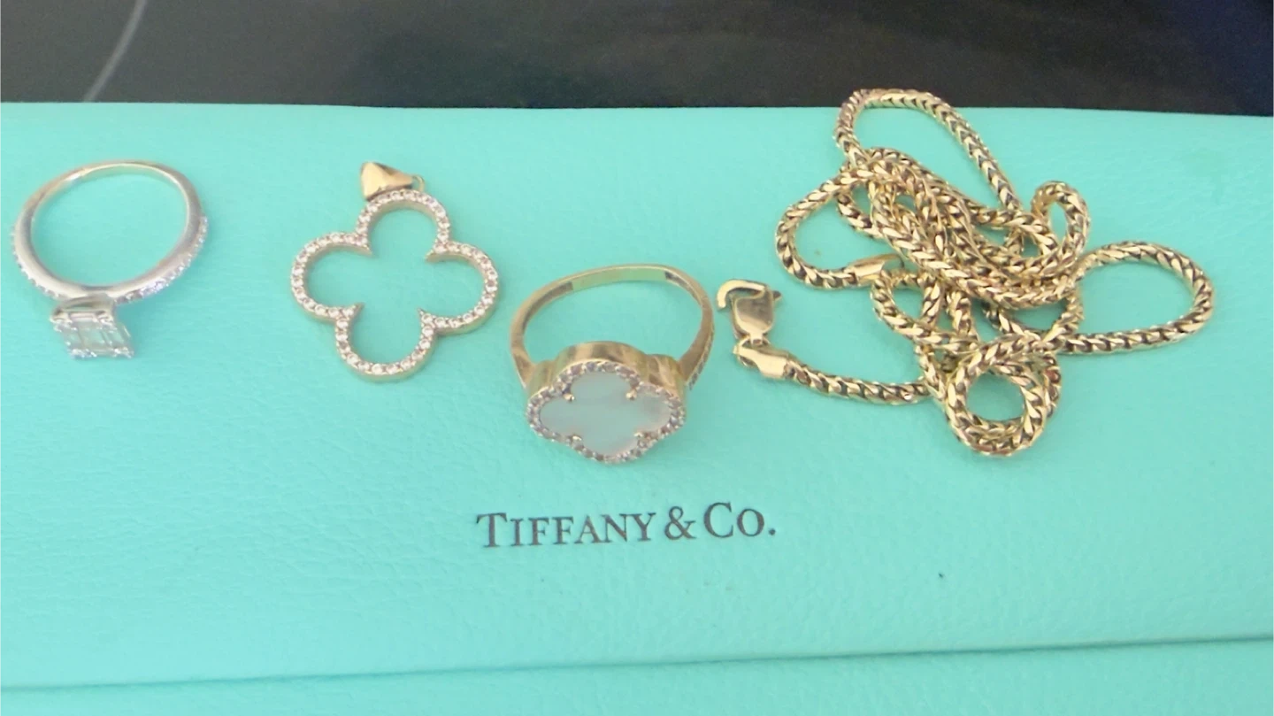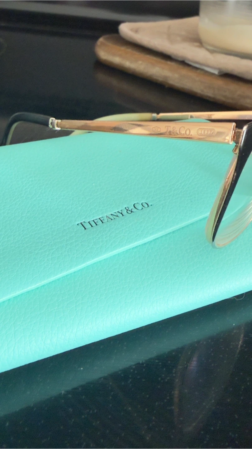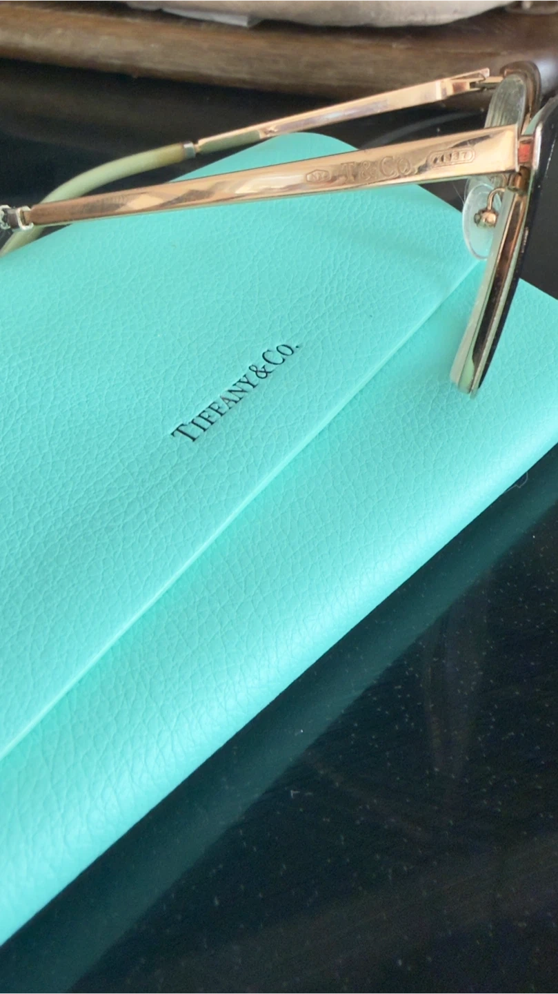 This listing includes a Tiffany & Co. eyewear case in their signature teal colour. Also shown are various jewellery pieces including rings, a pendant, and a gold chain, all on top of a Tiffany & Co. branded box.