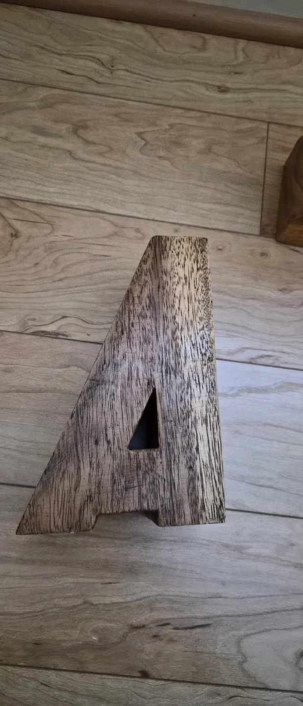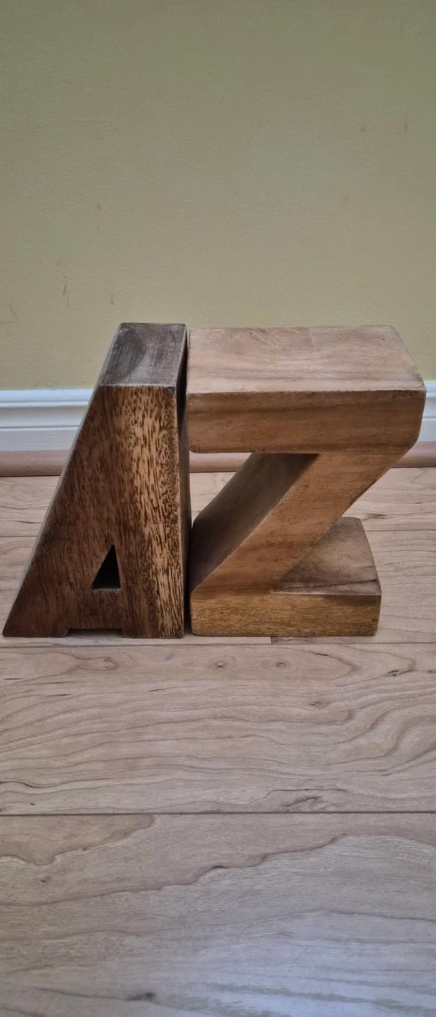 Set of two wooden alphabet letters, "A" and "Z". These decorative letters are made of solid wood with a natural finish. They're great for shelf styling or as unique home accents. Wood material.