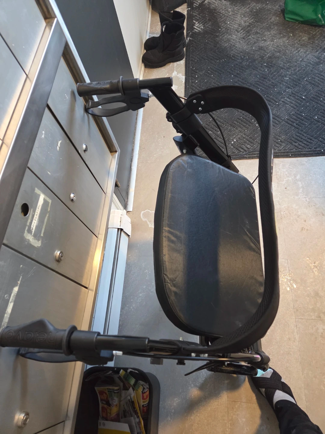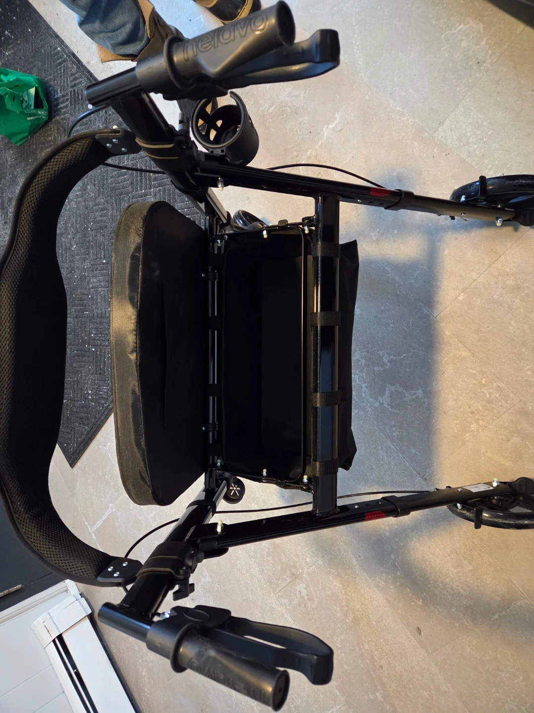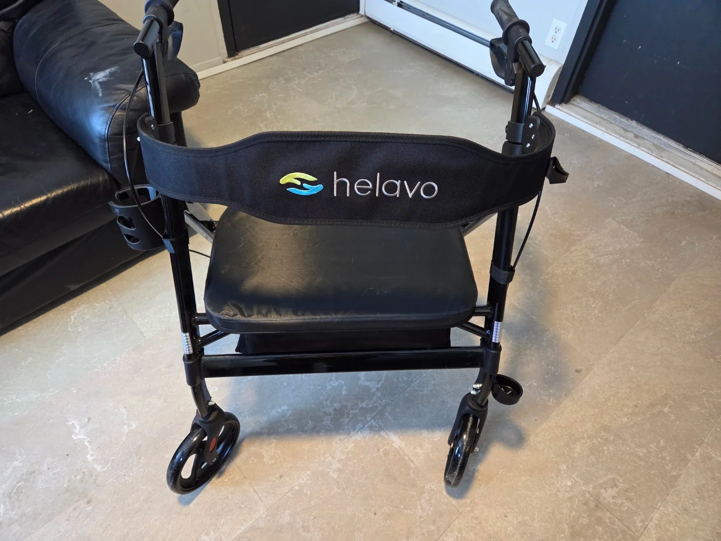 This is a Helavo H1050 rollator with a seat and basket. It's a black, four-wheeled walker. It features adjustable handles and a convenient cup holder. This rollator is designed to assist with mobility and provides a place to sit. Bought Nov. 2025. Used once indoors.
