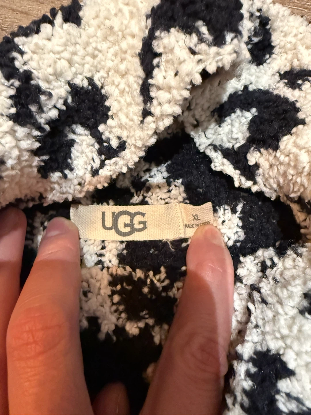 UGG women's leopard print fleece turtleneck sweater. Soft and cozy material for chilly days! Size XL. Made with 78% polyester and 22% nylon.