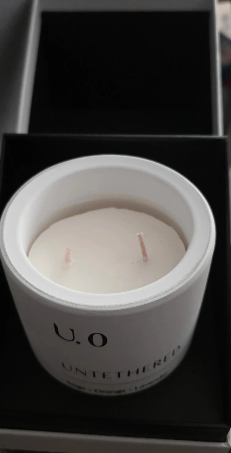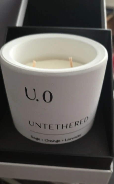 UO Untethered candle with a Sage, Orange, and Lavender scent. It has a double wick and comes in a white ceramic-style vessel. This candle's fragrance blend is designed to create a relaxing atmosphere.