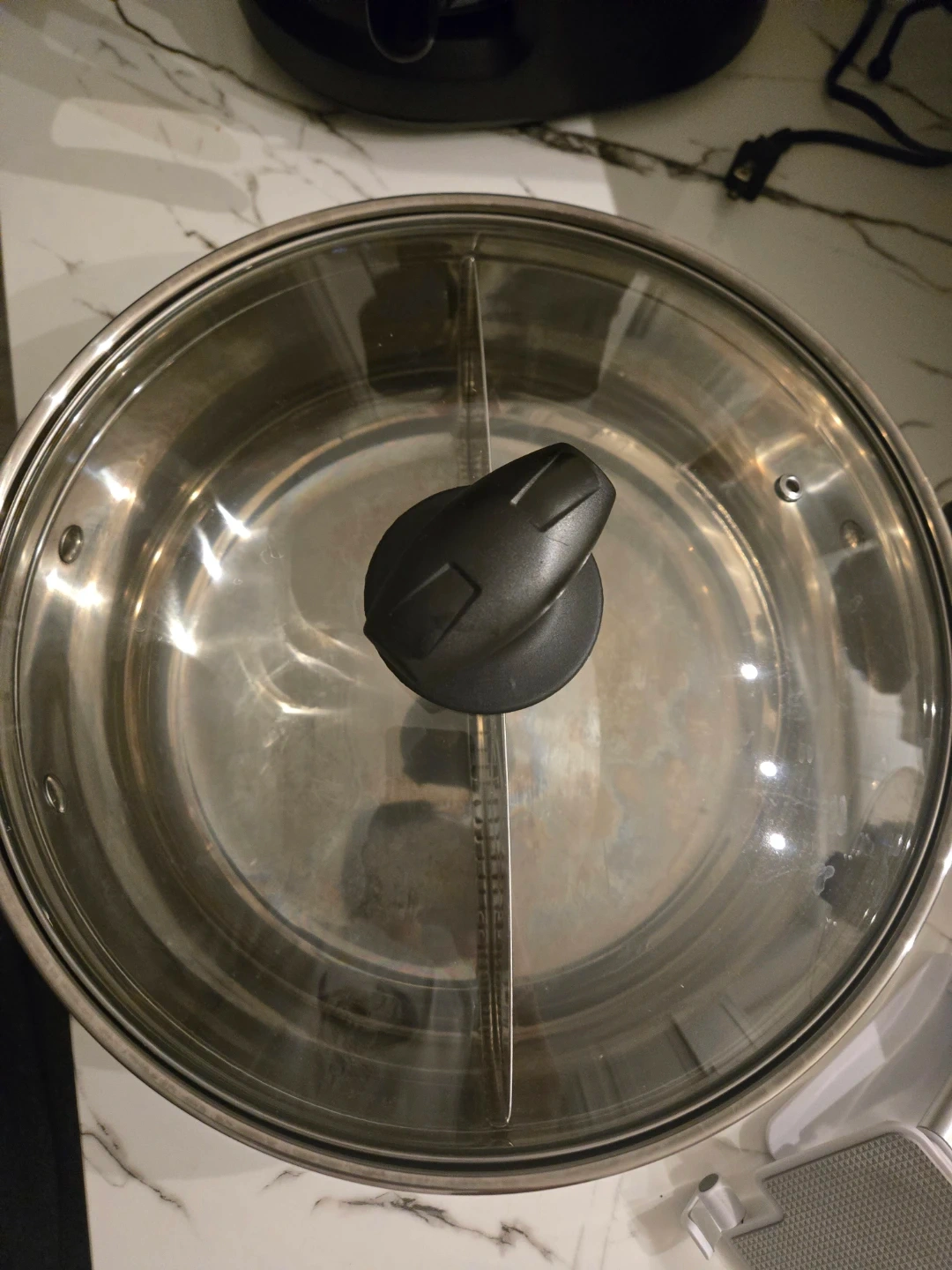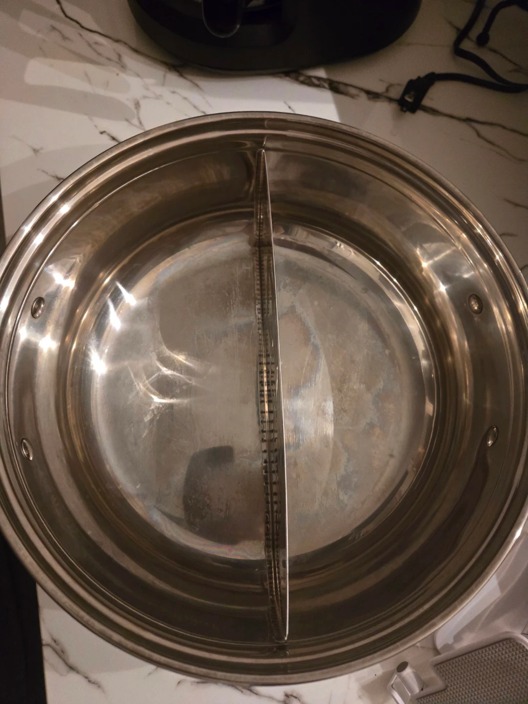 This stainless steel hot pot features a divided design for cooking two different broths simultaneously. It includes a clear glass lid with a black handle. Use it for a fun hot pot dinner at home!