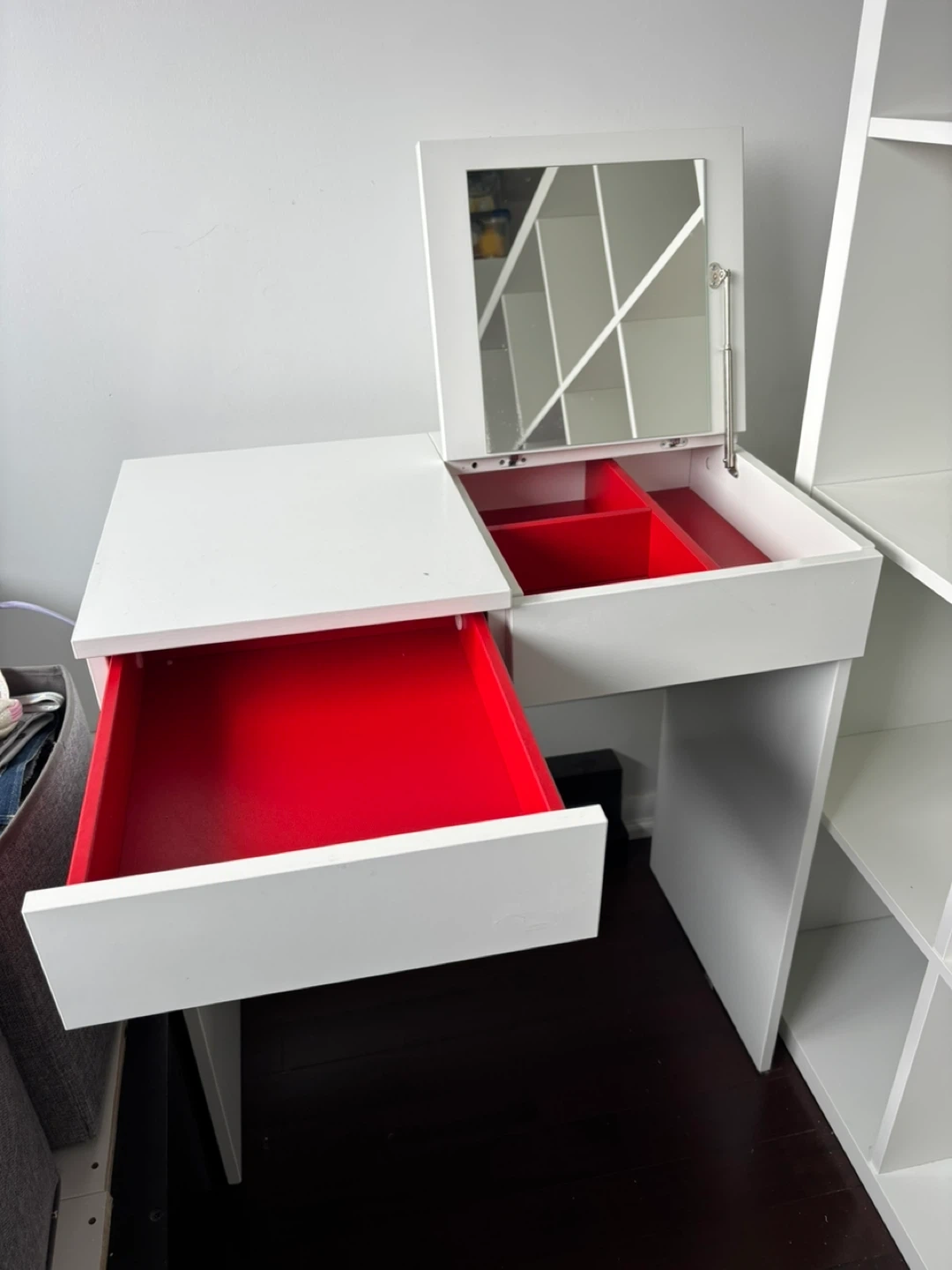 White vanity desk featuring a flip-top mirror with interior organizers. It has two drawers with bright red lining. This desk is great for storing makeup and accessories.