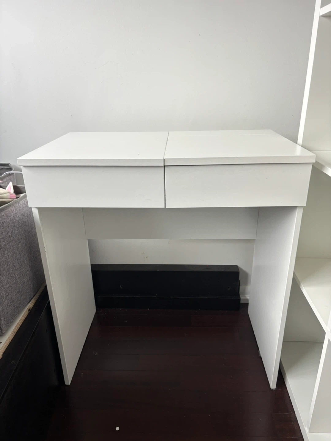 White vanity desk featuring a flip-top mirror with interior organizers. It has two drawers with bright red lining. This desk is great for storing makeup and accessories.